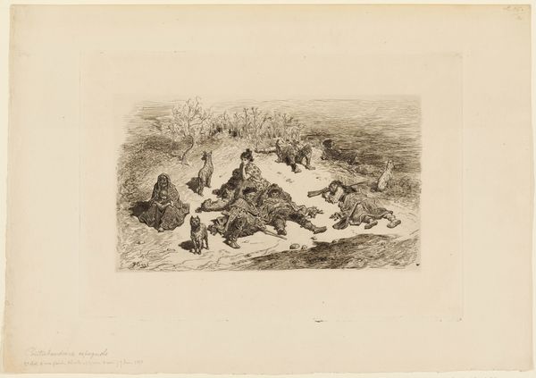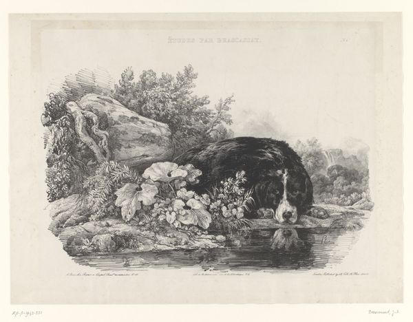 Eugène Cicéri’s lithograph, "Rotsblokken met tekenaar en vrouw," captures a rugged landscape with precise linearity and tonal complexity. At first glance, the composition seems to evoke a romantic vision of nature. The artist's use of lithography allows for a rich interplay of light and shadow, particularly evident in the textures of the rocks and foliage. The light source comes from the top right, creating a contrast between light and dark to define form and space. The human figures seated in the mid-ground lend the print a sense of scale but also function as observers, reflecting a broader engagement with themes of perception and representation. This print can be seen as a commentary on the sublime in nature, yet it carefully maintains a sense of order through its graphic structure. It invites us to consider not just what is depicted but also how the very act of depiction shapes our understanding and appreciation.