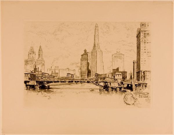 Curator: What a powerful piece! There’s an immediate sense of the vastness and vitality of a city in this oil painting. Editor: It does evoke that urban pulse, doesn’t it? This is Timur Akhriev’s “Skyline at Midday.” Although undated, its style and subject matter place it firmly in the realm of contemporary cityscapes. I find it very reminiscent of Impressionism. Curator: The way he captures the city… I think there’s an emphasis on a romanticized, almost mythological quality. The buildings stand as modern totems, symbols of ambition and collective identity, with the water acting as a visual mirror of the city’s subconscious. Do you find that it reminds you of similar depictions across different cultures? Editor: I see that reading, yes. Although the skyline’s become almost cliché, Akhriev reclaims it. Think about what it means to depict a city at “midday”—it's literally at the peak of its activity. The very act of painting this cityscape raises questions about urban development, immigration, and the sheer density of our modern experience. It serves as an archive of a time and place, inviting dialogue. Curator: The Brooklyn Bridge as an important symbolic passage and literal connector in society is rendered through intense warm reds and oranges in contrast to the blues and purples. And notice the repetition of rectangles of similar height! They visually unite architecture, emphasizing their relationship as if individual thoughts come together in a hive mind. The reflections in the water blur the boundaries between tangible structures and their ethereal counterparts, speaking perhaps to the impermanence of material achievements. Editor: Exactly! What stands out to me are those boats in the water. In relation to the skyline, they give us a better sense of scale and proportion to the painting as a whole. Plus, they represent connection—literally transportation that allows human connection from different places, a vital ingredient in any vibrant society. Curator: It will be interesting to consider how people react to its subject. Will its symbolism inspire them to reflect on urban living? I'm already excited to see more from Akhriev. Editor: Indeed! Perhaps its power to evoke recognition alongside critical reflection is its greatest achievement.