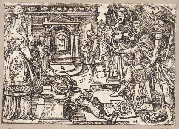 This is a stained-glass roundel, "Joseph Making Himself Known to His Brethren," created by Jan Swart van Groningen. The monochrome palette, predominantly shades of brown and white, lends a classical feel, enhancing the dramatic revelation at its core. The circular form contains a meticulously organized scene, with Joseph at the left, presiding over his brothers. The composition divides the space into distinct zones. Joseph, enthroned and gesturing, occupies a raised platform, while his brothers stand below. The architectural background, delineated with precise lines and geometric forms, reinforces the structured nature of the scene. A secondary figure stands in a niche behind Joseph, perhaps an advisor or guard. The use of light and shadow is subtle yet effective, creating depth and volume. The artist employs linear perspective to suggest spatial recession, drawing the eye towards the background. The composition's balance and symmetry convey a sense of order and stability, reflecting the narrative's themes of divine providence and reconciliation. In this circular window, Swart masterfully employs the interplay of form and narrative, transforming glass into a compelling visual story.