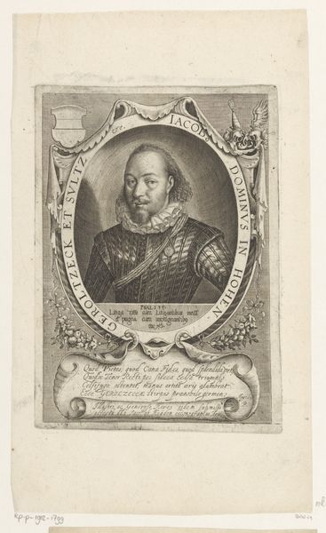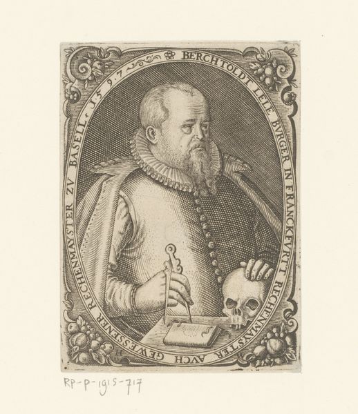 Curator: Lucas Kilian etched this portrait of Johann Conrad Brotbeck back in 1627. What strikes you initially? Editor: There's a powerful tension in the symmetry. The rigid oval framing battles the asymmetry of the symbols and the slightly off-center portrait. Curator: Tell me more. Editor: The memento mori—the skull—and the angels seem locked in a power struggle with the trappings of wealth and status. We've got the heraldic shield, the inscription proclaiming his nobility, and the sword indicating he had the right to sentence capital punishments, juxtaposed against reminders of mortality. Curator: From a formal perspective, the sharp contrast between the detailed portrait and the symbolic elements creates a compelling visual hierarchy. The stippling and hatching are exquisitely controlled, guiding the eye through a deliberate reading of Brotbeck's status and, as you mention, mortality. There’s something unsettling in this portrait's commitment to realistic detail coexisting with blatant symbols of the transience of earthly life. Editor: Indeed. Brotbeck held significant power in Würtemberg and wanted that acknowledged—but, by including these somewhat moralizing images, he seems conflicted, maybe worried that the system would punish him for his own rise to prominence. Does he wield power, or does power wield him? Look at how carefully he holds his letter as a secretary; he does not grip the hilt of that sword at his side with such certainty. Curator: His expression seems somewhat neutral. Neither defiant nor especially meek. As for the work, one could view it as a straightforward depiction of a powerful man made to emphasize certain inherent moral quandaries, rather than to praise the subject. Editor: This makes me question who such a work was for. It feels far less propagandistic than many images from this period, because it is willing to embrace ambivalence. Maybe his close family circle? Curator: It's a fascinating ambiguity that enhances the print’s lasting power, wouldn't you say? Editor: Definitely, I think you’re right. It is a thoughtful meditation on status.