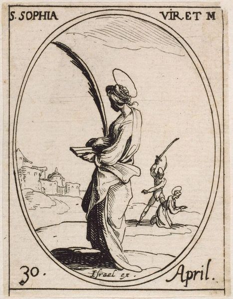 Curator: This is Jacques Callot's "Saint Irene and Her Companions," a small etching—less than eight centimeters tall—currently housed at the Harvard Art Museums. Editor: It's stark, isn't it? That executioner looming over Saint Irene, axe raised... the skulls scattered about. The whole scene is imbued with a peculiar sense of dread. Curator: Indeed. Callot, who lived from 1592 to 1635, had a way of capturing the horrors of his time. Notice how he uses the etching technique to create very fine, detailed lines, which really enhances the drama. Editor: It's almost journalistic. One can't help but think of the power dynamics here, of the systemic violence against women and religious minorities so rampant then—and now. Curator: Absolutely. Though small in scale, it encapsulates profound themes of faith, persecution, and resilience. It's hard to look away. Editor: It is. It's a chilling reminder that history always echoes into the present. Thank you for sharing.