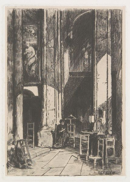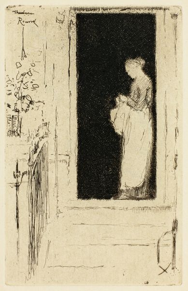 Editor: This is Walter Sickert’s ‘Study for ‘L’Armoire à glace’’, and it’s housed at the Tate. It feels incredibly intimate, almost voyeuristic. How do you interpret this work? Curator: This piece compels us to consider the Victorian and Edwardian gaze, doesn't it? Sickert often depicted women in domestic interiors, spaces historically coded as feminine. What power dynamics do you see at play here, given the implied viewer and the woman's secluded position? Editor: It does make me uncomfortable, like I’m intruding on a private moment. Curator: Precisely. Sickert challenges us to confront the uncomfortable truths about spectatorship, gender, and the voyeuristic tendencies embedded within art history itself. This sketch is a portal into a complex socio-political dialogue. Editor: That’s a lot to consider. Thanks! Curator: My pleasure! It’s important to acknowledge the role art plays in power structures and to invite critical discussion.