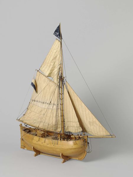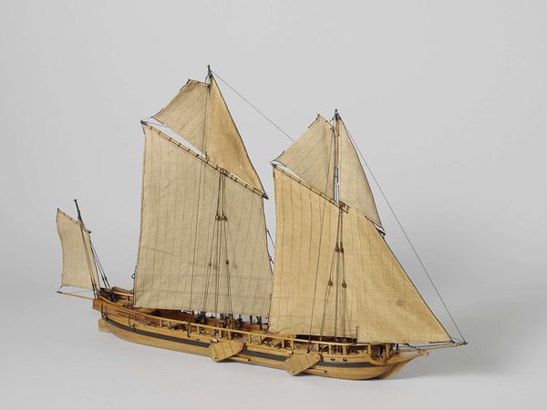 Curator: This mixed-media sculpture, dated circa 1865-1876, is entitled "Model of a Lifeboat." Editor: My immediate reaction is one of serenity. The light reflecting off the sails and the precision in the craftsmanship exude tranquility. Curator: The piece brings into focus the production of maritime safety; what strikes me is how such an object serves a dual function—both aspirational, symbolizing rescue, but also highlighting the ever-present threat to those who work on the water. Editor: Yes, but the perfect symmetry! The curve of the hull, the geometry of the sails! It’s almost mathematically pleasing, wouldn't you agree? It adheres to principles of realism but its almost elevated to some perfect state. Curator: Precisely. I'd suggest that considering it from a perspective of labor expands our perception. Think of the collective labor that this represents. The individual that assembled this knew the social structures associated with seafaring occupations, where labour divisions were significant and hierarchial. Editor: I do not refute that, however I still argue for appreciating the formal properties. Notice how the texture of the wood creates contrast with the white paint on the hull. The dark lines on the off white sails work beautifully with the structure of the frame. Its texture is very calming to me, that invites deep reflection. Curator: The use of varied materials is telling: the wood frame, the detailed rope work. Its consumption in middle-class households tells stories about the complex interaction between culture and industry and a celebration of colonial trading in the high seas. Editor: For me, this work of art exists outside of history; its value transcends mere production. The interplay between its lines and shape has almost meditative qualities to them. This particular selection and juxtaposition of shapes invites me to relax. Curator: An interesting analysis— it’s insightful to approach the work on both a material and aesthetic plane, to realize how both reinforce the broader context in which its being observed, Editor: And in considering form and social background together, perhaps, we approach a fuller sense of how people can relate to artwork across eras.
