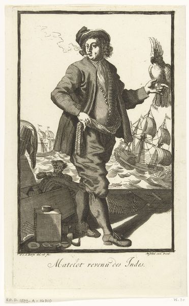 This etching, "Boer uit Friesland," was made by Pieter van den Berge in the Dutch Republic, sometime between the late 17th and early 18th centuries. It depicts a farmer from Friesland, a northern province known for its distinct culture. This image offers a glimpse into the social dynamics of the Dutch Golden Age. The Dutch Republic witnessed a surge in wealth and global trade, which fueled a growing interest in depicting different social types. Prints like this one served a dual purpose: they provided entertainment to urban audiences while reinforcing social hierarchies. The exaggerated clothing of the Frisian farmer and the ship on the sea in the background are clear visual codes for an audience familiar with the cultural diversity of the Republic. To fully grasp the print's significance, we would want to investigate the production and consumption of images in the Dutch Republic. By looking at sources like period writings about the cultural habits of the Frisians, we can better understand the social norms and biases of the time.