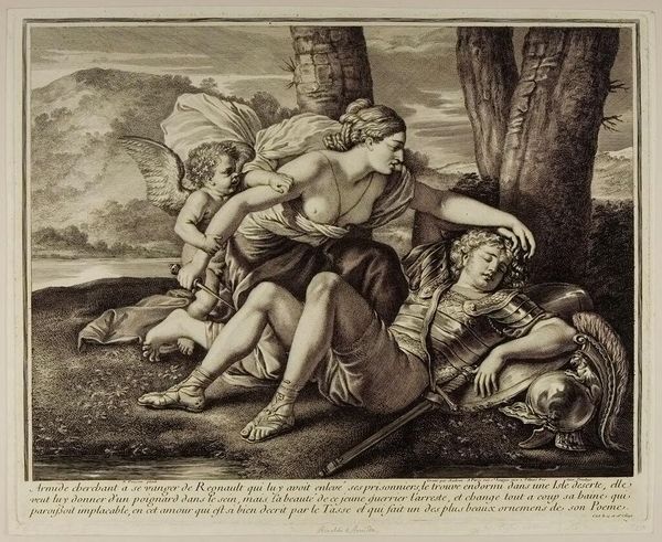 Curator: This is Simon Charles Miger’s "Hercules and Omphale," and I'm immediately drawn to its textures. Editor: Yes, you're right! The hatching and cross-hatching create a really soft, almost dreamlike quality. The whole scene feels so languid. Curator: It's a fascinating take on power dynamics, too. Omphale has Hercules' club while he's stuck spinning wool. It really speaks to the commodification of heroes. Editor: Interesting point! And Miger's choice of engraving emphasizes the physical labor involved in reproducing images. It's a direct connection between the artist's work and the mythological tale. Curator: I love how it flips the script, making us question these very traditional roles. The cherubs almost seem to be mocking the whole thing! Editor: It makes me think about the social function of art and its reflection in labor, a material record of a cultural moment. Curator: Definitely gives you a lot to ponder about, doesn't it? Editor: Absolutely. A rich combination of mythology and process, indeed.