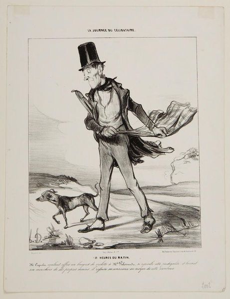 Curator: This lithograph by Honoré Daumier, titled "That Man, Leaving the Coffee House...", presents a rather dejected figure. What's your immediate take? Editor: Gloom. Utter dejection. The slumped posture, discarded boots – he's clearly at rock bottom. Curator: Daumier, known for his social commentary, likely intended to critique the societal pressures that lead to such despair, perhaps gambling debts as the text below the image suggests. Editor: Absolutely. We can read this in relation to capitalism, the class divide, and the crushing weight of financial instability on the working class. It's a raw depiction of masculine vulnerability. Curator: Daumier created art for the people, using satire and caricature to expose injustices. This work, accessible and immediate, speaks volumes about the human cost of economic hardship in 19th-century Paris. Editor: It prompts us to question: Who benefits from such systems, and who is left behind, barefoot and broke? It still resonates deeply today.