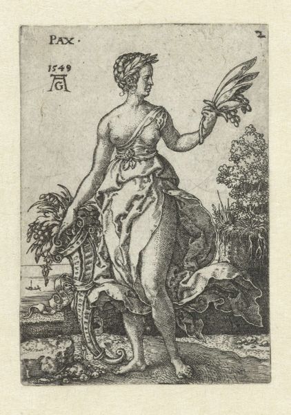 This engraving, "Gematigdheid," or "Temperance" was created by Heinrich Aldegrever. The artwork is a study in contrasts, structured around a central female figure. Note how she dominates the composition, standing tall with a spear, dividing the space. To her left, a rough, natural landscape; to her right, a more constructed, architectural setting, creating a visual dichotomy between nature and civilization. The details etched by Aldegrever invite close inspection. The seemingly simple composition operates as a semiotic system. The fish and bird emblems, along with architectural motifs, aren't merely decorative; they're signs referring to the complex cultural codes of the 16th century. Aldegrever is challenging us to decode these signs, destabilizing the fixed meanings. The figure's gesture, pointing toward the architectural structure, prompts us to consider how societal structures and personal virtue intersect. In closing, the stark contrast achieved through line work isn't just aesthetic. It's a philosophical statement, inviting ongoing interpretation of the artwork's meaning and relevance.