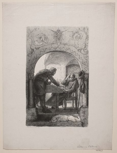 Georg Friedrich Schmidt made this print titled ‘Smoker and Drinker’ using engraving techniques. It shows two men indulging in tobacco and alcohol, and such imagery in 18th-century Europe offers a glimpse into the social life of the time. Made in Germany, this scene would have resonated with a society undergoing significant shifts in class structure and cultural values. The print hints at the growing accessibility of once-luxury items, like tobacco, to a broader populace, challenging the traditional aristocratic monopoly on leisure and pleasure. Schmidt's decision to depict such everyday activities also reflects a broader trend in art toward representing common life, diverging from purely historical or mythological subjects. By exploring archives and period documents, we can better understand the culture of leisure and consumption depicted here. The historian’s role is to interpret art as a reflection of its time, always contingent on the social and institutional context.