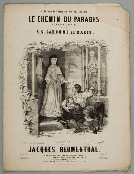 Curator: This is the cover of the sheet music for "The Employment Office," a comic scene intended for performance at the Théâtre des Variétés. Editor: It feels like a Chaplin film waiting to happen. The contrast between the clownish figure and the seated gentleman—a clash of expectations, maybe? Curator: Absolutely, the image plays on the societal roles and the performativity of labor. Circa late 19th century, perhaps? Sheet music covers often served as visual commentary. Editor: There's a silent tension here, like a punchline that hasn't landed yet. I love the way the artist has used shadow. Curator: Consider the performance context, how this image would prime the audience, shaping their expectations of both the music and the theatrical presentation. Editor: Yes, it’s all about the setup, isn't it? Leaving us poised right before the song begins and the curtain lifts. Curator: Precisely. A glimpse into the social theater of the 19th century. Editor: I could imagine the two characters breaking into a song any minute now.