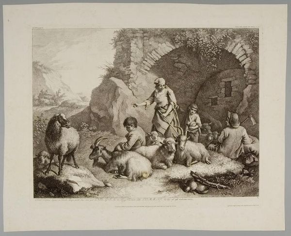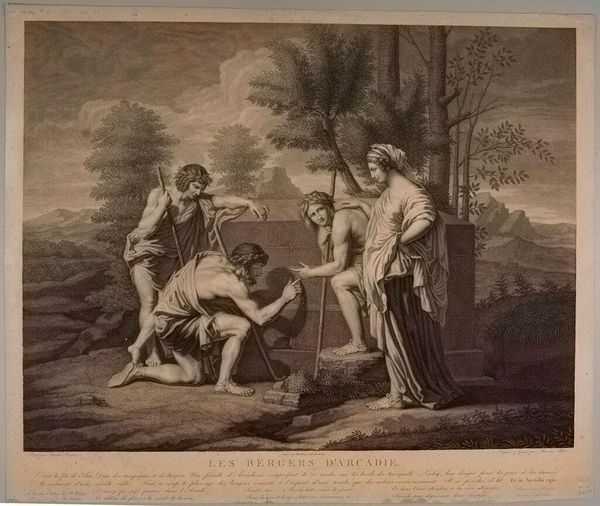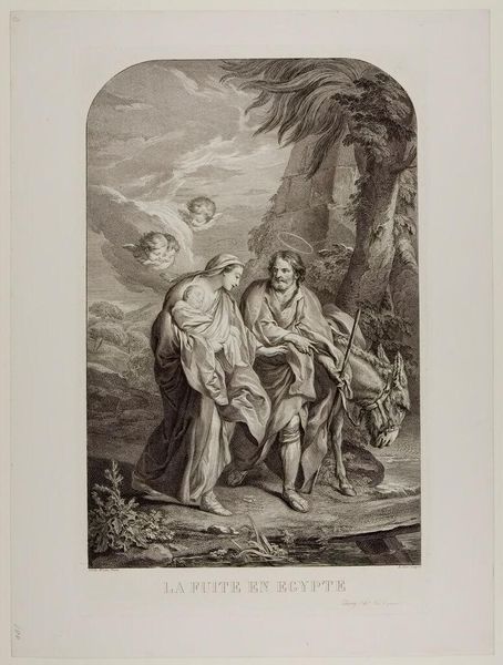Curator: The work before us is a print called "The Child Saint John meeting the Christ Child on the way" by Conte Carlo Lasinio, now residing in the Harvard Art Museums. Editor: It’s remarkable how much tenderness is conveyed through such simple lines; the embrace feels so poignant. Curator: Note how the artist arranges the figures in the foreground, their garments cascading with neoclassical elegance, while the landscape fades into a distant, almost dreamlike background. Editor: It speaks to the socialization of religious figures, and the gendered expectations placed upon them. The nurturing embrace of the Virgin is juxtaposed with the presumed path of the male figures. Curator: An astute observation. Lasinio masterfully uses the medium of etching to create a dynamic interplay of light and shadow. Editor: It reminds us of how religious narratives have historically been used to reinforce societal norms, but also offer spaces for reimagining connections. Curator: Indeed, the artwork's composition and linear elegance invite contemplation. Editor: Absolutely. It leaves us pondering the historical interpretations and our own contemporary perspectives.