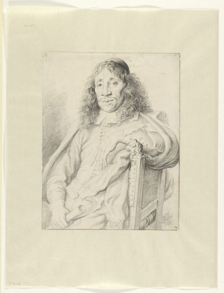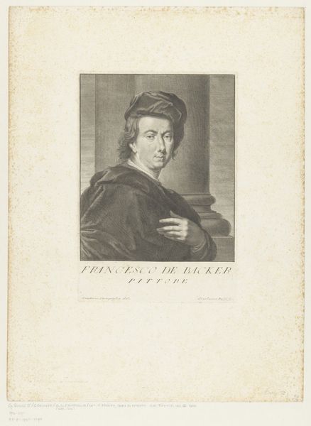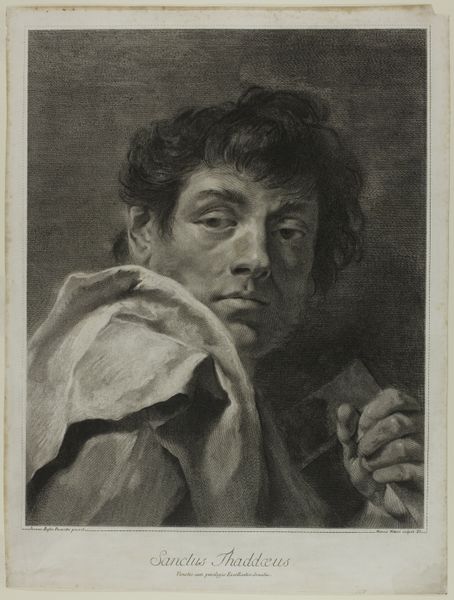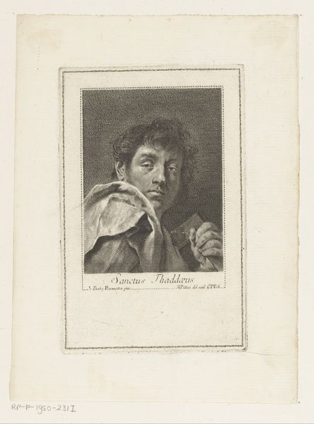 Curator: Look at this, a portrait titled "Apostel Judas Thaddäus," or "Apostle Jude Thaddeus," by Giovanni Marco Pitteri, likely created between 1712 and 1786. What's your take, friend? Editor: Intrigued, instantly. It gives off this incredibly subtle, melancholic vibe, despite being quite detailed for a print. There's a weariness in the Apostle's eyes. Almost a weight he carries...or is it just the toned paper aging theatrically? Curator: I’d argue Pitteri really emphasizes line here, wouldn't you say? The quality of the engraving speaks to that. See how he creates depth using only variations in the fineness and density of those etched lines. A real testament to process! Editor: Absolutely. It highlights the labour behind these now ‘mass-produced’ religious icons of Baroque printmaking, elevating the status of engraving at the time. Also, Judas seems to be clinging to some kind of object here - like a square or possibly a book? Is this meant to give insight to how he made objects or engaged with others? Curator: Some scholars identify it as a club. If so, that can give us greater insight. The club might relate to his martyrdom in tradition. He's usually depicted holding a club or halberd, instruments of his death. This interpretation allows us to see him not just as an individual but as a figure of unwavering faith. Editor: Right. But isn't that intriguing then? The means of its production, the way it was disseminated. Religious iconography made available through print—talk about making the divine tangible. The Baroque clearly plays with surface texture; look how even a ‘low’ medium like print has the potential to make a truly high impact. Curator: It is a testament to print's strength. We begin thinking about how, from simple etched lines on a metal plate, a narrative, a sense of emotion, a complete world can be spun, one meant for countless hands. Editor: Exactly. That’s the fascinating contradiction that lives on the surface here. Curator: Well, thinking of dissemination, that engraving reminds me of how stories outlive materials. The idea will probably still inspire long after the print is forgotten, wouldn't you say? Editor: Certainly! It has left a profound resonance, after all. Thanks to Pitteri's skilled hand, it certainly shows that materials and means, however modest, really shape how these stories stay with us.