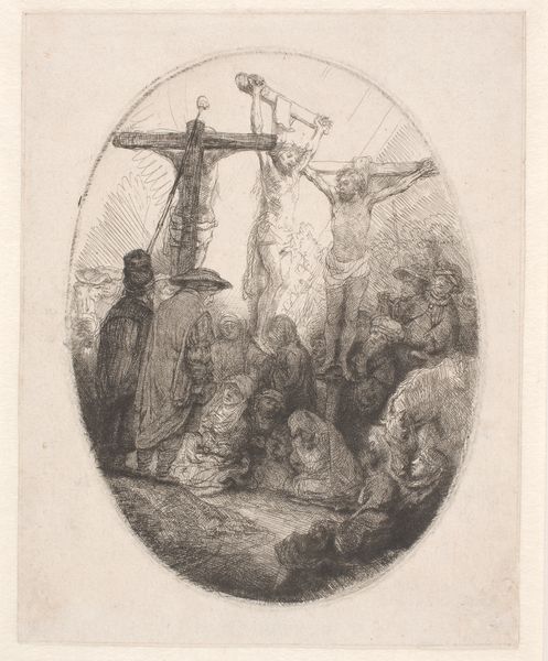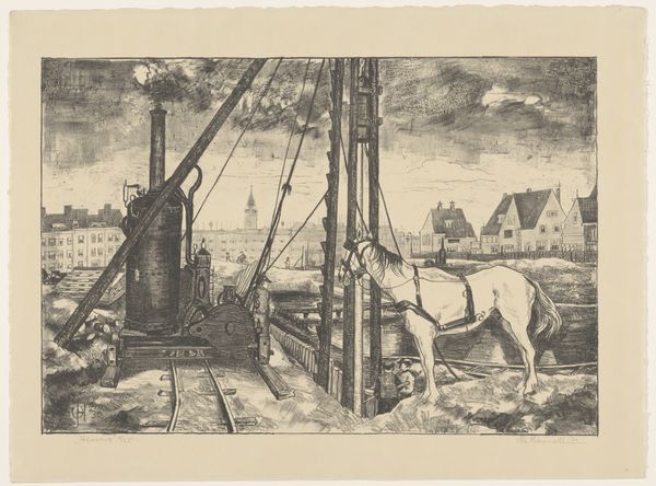 Curator: Immediately striking! There's a dizzying sense of implied movement in this etching. The precarious balance of the figure against the thronging crowd is palpable. Editor: Indeed. This work by Henri François Schaefels, made sometime between 1837 and 1888, is entitled "Menigte aanschouwt hoe een man over de spriet van een boot loopt," or, "Crowd watching a man walk over the spar of a boat." It’s quite descriptive! The print captures a street performance; the crowd appears on the verge of chaos. Curator: The central figure teetering on that extended spar evokes ancient myths of trials and tribulations. It almost resonates with imagery from, say, the trials of Hercules – the cultural memory encoded here suggests a link between everyday spectacle and these mythic journeys. There's a subtle nod to human endurance amidst collective action. Editor: What interests me is the deployment of light and dark to amplify this sensation. Look at how the artist etches the shadows to contrast with the light catching on the figures faces. The sheer density of lines in the foreground makes the crowd almost claustrophobic, wouldn't you agree? Then our gaze is drawn upwards, following that diagonal line of the spar. Curator: Precisely. And the symbolism of the elevated position. This act of balancing isn’t just a skill demonstration; it mirrors aspirations—the constant societal tension between ascent and the ever-present threat of a fall, both literal and metaphorical. Note also how that distant spire punctuates this visual dance, it echoes cultural pride, stability versus the fluidity and uncertainty of this daredevil feat. Editor: The technical virtuosity on display is compelling, especially when one considers the minute detail achievable through etching. And it allows for this fascinating contrast between stasis and dynamism. The ships, though massive, provide a relatively stable background to this hubbub of bodies. Curator: It reminds us that human dramas are perpetual, and these performative displays, however commonplace, are potent signifiers of broader communal desires and cultural narratives of risk and reward. Editor: I concur; there’s a narrative richness in its textures that holds the eye, long after we grasp the overt subject. The use of line creates depth, guiding us into a detailed scene brimming with the kind of human interactions you could spend hours deciphering.