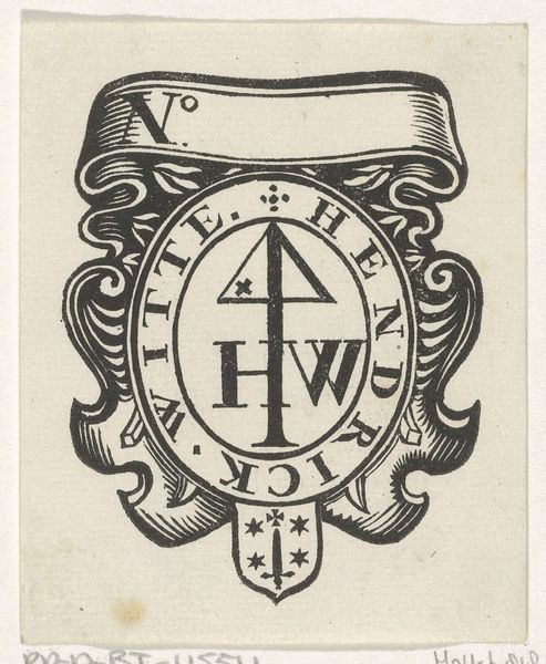 This anonymous vignette of Hendrick van Diepenbroeck presents a study in contrasting textures achieved through line work on paper. The composition is primarily oval, defined by a laurel wreath encircling the namesake's name. Observe how the artist used lines of varying thickness and density to create a hierarchy of visual interest. The lettering, rendered in crisp, clear lines, contrasts with the denser, more textural rendering of the leaves. The central motif, a cross above the initials 'A' and 'B', stands out due to its stark simplicity and the negative space surrounding it. The use of black and white enhances the graphic quality of the piece, reducing it to its most essential elements. In this way, the image operates as a symbolic emblem, where each element contributes to a carefully constructed meaning. It offers a fascinating glimpse into the semiotic language of its time, where symbols and typography were meticulously arranged to convey identity and status.