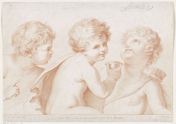 Editor: Here we have Francesco Bartolozzi's "Drie putti," possibly from 1796. It's a print, using etching and engraving, and rendered mostly in lines. The subject matter and the title would seem to point at an allegory. I’m immediately drawn to the softness of the figures, almost like chalk. How would you interpret this work? Curator: Consider how Bartolozzi used engraving. It’s a *reproductive* process, mediating between the original artwork and its consumption. He wasn’t inventing ex nihilo; he was translating, disseminating images, ideas, styles – to a wider audience. Editor: So, you’re focusing on how the print functions as a product? Curator: Precisely. And what does this say about the relationship between art and craft at the time? Engraving was often seen as a lesser art form because of its reproductive nature. But look at the detail, the labor involved! This print blurs those hierarchical distinctions. Also, what class of people would own and collect these engravings and why? Editor: I suppose wealthy consumers decorating their homes? Curator: Exactly! How might that context change the way we view these cherubic figures? Editor: It shifts the focus from pure artistic expression to broader questions about production, consumption, and social class. Curator: And ultimately, about the complex networks of labor, materials, and exchange that sustained artistic creation and consumption.