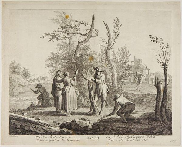 Editor: This is an etching by Jean Baptiste Michel Duprée, titled "Spurred by my mockery, he exerted himself and won the prize". It has a quaint, storybook feel. What can you tell me about its context? Curator: The title and imagery suggest a narrative about motivation, perhaps fueled by social pressure. Who is doing the "mocking," and what does "winning the prize" signify within the social dynamics depicted? This could be a commentary on societal expectations and performance. Editor: So, it's not just a simple scene? Curator: Not at all. Consider how gender and class might be playing out here. Who is allowed to mock, and who is expected to perform? These visual narratives are rarely neutral; they often reinforce or subtly critique existing power structures. What do you think? Editor: I didn’t see that at first. I'll look more closely at that. Thanks. Curator: Always question what’s presented, and whose perspective is being centered.