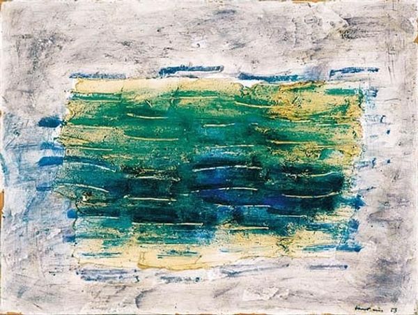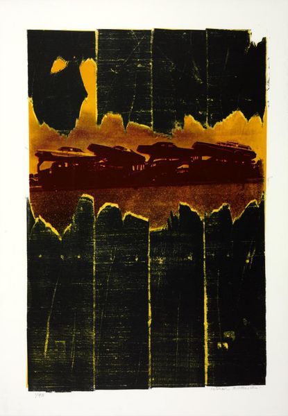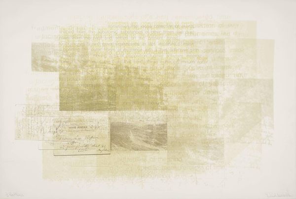 Curator: David Leverett, born in 1938, created this work, "Two Faces of a Place." It's currently held in the Tate Collections and presents a fascinating interplay of image and text. Editor: My first thought? Fragmented memories. It feels like a landscape seen through a broken window, or a dream slowly fading. Curator: The layering here is key. Leverett is exploring how we construct meaning through both visual representation and language, challenging the idea of a single, unified perspective. It brings up questions of accessibility, particularly with the script overlaying the landscape. Who is invited to "read" this place? Editor: Absolutely. It’s like the landscape is trying to speak, but the words are almost illegible, like a half-forgotten poem scribbled in a fever dream. Are we meant to decipher it, or just feel the texture of the words? It's like he's blurring the line between seeing and feeling. Curator: Perhaps both. The act of trying to decipher it, of engaging with the fragmented text, becomes part of the experience. The "touch of Braille" that's actually written there is very interesting too: is the landscape inviting you to 'read' it? I keep thinking about what it means to 'read' a landscape at all. Editor: You know, looking at it again, there's a certain melancholy to it. It's beautiful, but also unsettling. Like a place that's been loved, lost, and remembered imperfectly. Curator: Precisely. It makes me consider our relationship with place, memory, and the stories we tell ourselves about them. Editor: It really is a piece that stays with you, whispering its secrets long after you've walked away.