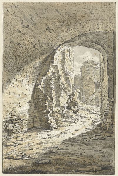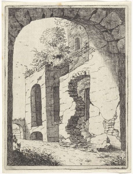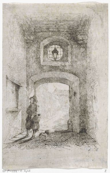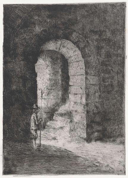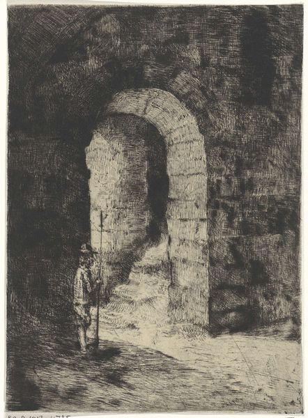 Editor: Right now, we're looking at "Gewelf met bewaker" by Arnoud Schaepkens, an etching done sometime between 1831 and 1904. The etching depicts a figure standing in the foreground of what looks like a vaulted archway. It feels quite stark. What catches your eye when you look at this print? Curator: Well, firstly, it whispers stories of hidden histories. This guard, dwarfed by the architecture, guarding what, exactly? The archway, with its textured stone, speaks volumes of time and perhaps of empires, crumbled but not forgotten. Don't you find yourself wondering what secrets lie just beyond that doorway? And the etching itself—the way Schaepkens uses light and shadow almost feels like he's trying to coax those secrets out. Editor: Absolutely! I get a sense of mystery from the intense shadows. It almost feels theatrical, like a stage set. Was this common in prints of the time? Curator: That's a great observation! Genre paintings with figuration were quite trendy and Schaepkens created here something very dramatic. And to get a bit fanciful – and maybe a little rebellious of me – I wonder if the artist is playfully nodding towards those romantic ideas, while subtly hinting at something much deeper. Perhaps something about power and its guardians... Or, maybe he just needed a cool backdrop for his little play! What do you think? Editor: I think I’m still drawn to the theatre aspect, maybe that has to do with scale and realism. It's small but the archway feels massive in comparison to the guard. It seems almost satirical or as if in service to some grand tale that needs embellishment to work, no? Curator: Mmmh! A grand tale… or is it all a grand illusion? Perhaps Schaepkens wants us to question what's real and what is just… story-telling, what has substance and what is façade. But perhaps that's what great art does, after all – tickle our thoughts and let us find our own narratives. Editor: I agree. It's fascinating to see how a seemingly simple scene can hold so much for reflection. Curator: Absolutely. Art, in the end, isn't just about what we see, but about what we imagine!