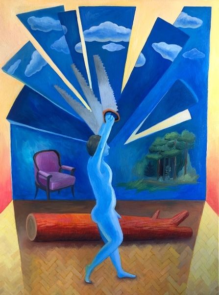 Editor: Soltan Soltanlı's "The Decorated World," created in 2018 using acrylic paint, presents a serene yet peculiar landscape. I find the whimsical tent-like structures and the solitary figure both comforting and slightly unsettling. What do you see in this piece? Curator: The "tent" structures immediately draw my eye. They appear almost like pavilions, drawing on a historical fascination with temporary architecture, spaces of ritual, leisure, or even defense. Notice how Soltanlı tops them with stylized foliage. Doesn't this combination—fabric and plant—evoke the ephemeral nature of life and beauty, a memento mori translated into landscape? Editor: That's interesting! I hadn’t considered that symbolism. So, the "decorated world" is perhaps about how we construct fleeting refuges for ourselves? Curator: Precisely! Consider, too, the lone figure. What does her relaxed posture and unadorned dress communicate within these decorated shelters? Does it suggest contemplation? Retreat? Are the different colors of the tents representing varied emotional states or personal histories, almost like individual dreamscapes within a collective experience? Editor: The differing tent colors hadn't struck me as symbolic before, but thinking about them as different emotional states makes the scene much more complex. There’s an underlying sense of introspection that I completely missed at first glance. Curator: These symbolic spaces, at once constructed and natural, allow us to reflect upon our place within the world and question the boundaries between artificiality and nature. Symbols invite inquiry, urging us to decipher meaning. Editor: It's amazing how much can be hidden within such a seemingly simple landscape! It has certainly altered how I interpret the image – thank you for pointing that out.
