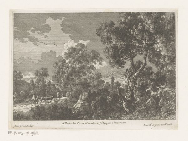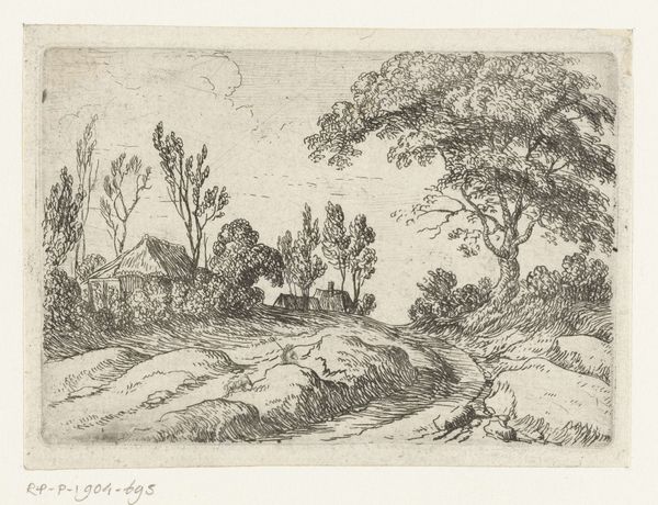 Curator: Our focus here is a work by Joseph Charles Cogels, dating back to 1804, entitled "Landschap met hoge rots en een herder op de voorgrond"—or, "Landscape with high rock and a shepherd in the foreground". Executed with drawing and etching techniques, this print showcases Cogels's skill. Editor: Well, my first impression is this really captures a feeling of quiet observation. I mean, the rock looming up there... It’s as though we’ve stumbled upon some ancient, peaceful ritual in nature. It’s oddly comforting. Curator: The composition is meticulously structured. Observe how the strong verticality of the rock formation intersects with the horizontal flow of the stream. This intersection not only creates a dynamic visual tension but also guides the eye through the landscape. Editor: You're right; it’s a masterclass in leading the eye. It almost feels staged in the way we are brought to contemplate this little figure. A narrative pops out! Makes you wonder, who is this shepherd? What are his sheep doing, scattered all over the place? It’s a perfect stage for introspection. Curator: Absolutely. The shepherd figure functions as an allegorical symbol—perhaps the relationship between humanity and nature, a recurring theme in Romanticism, the stylistic element prominent in this work. Note also Cogels's deliberate use of light and shadow; this contrast enlivens the landscape, giving depth to the etching. Editor: Agreed, I love the textures too. The rocks almost feel crumbly! I’d want to sink my fingers into the dirt if I were standing there. Even though it’s small, I can almost feel the chill of the air off that mountain. Curator: Ultimately, Cogels masterfully deploys formal elements to provoke a sense of the sublime. Editor: He truly turns what could've been a sketch of some bloke watching sheep into something strangely moving. It's great. Curator: Indeed, an exemplar of its era. Editor: Totally agree. Thanks for showing me this.