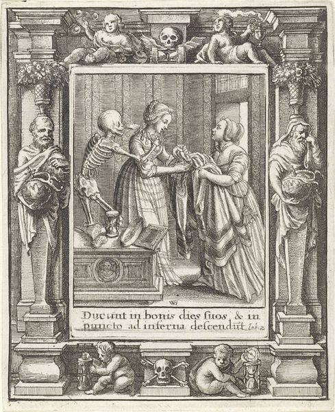 Curator: Before us, we have "Expulsion from Paradise", an engraving by Wenceslaus Hollar, created in 1651, now residing in the Rijksmuseum. Editor: My first impression is how claustrophobic yet dynamic it feels. All the figures seem to be rushing away from the center while boxed in by an elaborate frame. The darkness in the etching adds to that unsettling sensation, almost as though doom were inescapable. Curator: The print depicts Adam and Eve being banished from the Garden of Eden. Consider the social and political backdrop of the time. Europe was grappling with the aftermath of the Thirty Years’ War, a period marked by immense upheaval and religious conflict. This imagery of loss and displacement surely resonated deeply. Editor: Absolutely. It's interesting how Hollar frames the central scene not just with architecture, but with personified allegories – note the figure with the scythe. The Latin inscription reminds us of God's words about toil. It powerfully blends the immediate, corporeal drama with larger symbolic contexts concerning labor and the human condition post-Eden. What societal roles are presented? Curator: Well, you have figures such as Adam and Eve but they were still being framed from a very Judeo Christian perspective which we still feel today. This isn't to mention that there are societal issues of forced or unforced labor here too. There's commentary on what role these allegories or even figures of mythology had during and beyond their conception as the audience shifted from the people who built the framework around this system versus the current world. Editor: And it is not like the current audience is entirely devoid of bias too as interpretations will continuously change with any societal shifts as people look through it differently than its inception. Overall, an exploration that reveals how historical turmoil intersects with deeply ingrained anxieties about mortality and the nature of existence. Curator: Precisely! Looking at it this way reveals layers upon layers. It's really fascinating and speaks to the lasting impact of this work and Hollar's abilities as an artist to create it.