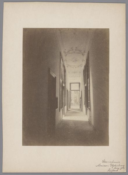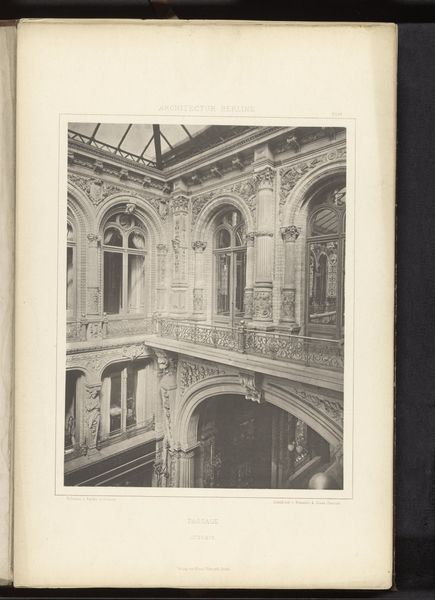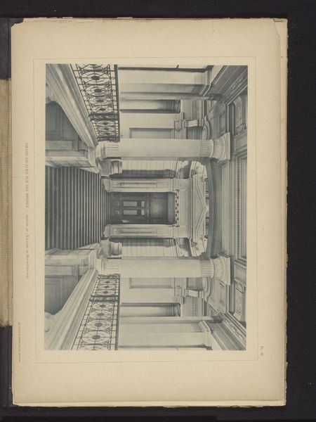 Curator: Standing before us is a photograph, taken before 1894 by an anonymous photographer, depicting the grand staircase on the western side of the Palace of Justice in Brussels, Belgium. The photograph showcases the building’s Neoclassical style through a realist lens. Editor: It's immediately imposing. The sheer scale is quite arresting, isn’t it? All those receding steps dwarfing any implied human presence. A silent, weighty space. Curator: Indeed. The repetition of geometric shapes, those pillars, arches, and stairs create a powerful impression, echoing the importance of civic architecture. Think of the Palace itself. Its architecture aimed to project a very deliberate message about justice, law, and state authority. Editor: And the symbolism, perhaps? The ascent toward justice? One imagines countless individuals climbing these stairs, bearing burdens or seeking verdicts. There is a tangible, if muted, narrative imbued in this composition. Curator: I find it fascinating how the photograph itself, rendered in monochrome, affects its impact. It adds a sense of timelessness but also maybe hints at the rigidity of law, and the removal of colorful human stories within its process. Editor: It's intriguing how the choice of perspective—looking directly up the staircase—emphasizes the building's dominance. One could feel quite small entering that space, potentially amplifying feelings of vulnerability within the justice system itself. The anonymous nature of the photographer reinforces the sense of officialdom, don't you think? Curator: I concur, anonymity further depersonalizes the process. I do appreciate, however, that the photographer immortalized this viewpoint, documenting the imposing scale, which arguably has, in its way, begun to take on its own, different kind of emotional weight and symbol over the decades. Editor: It has. As a piece of social and architectural documentation, this artwork serves both as a testament to the ideals the Palace aimed to embody and a poignant observation of the physical and, dare I say, psychological structures that uphold our justice system. Curator: Exactly. Looking at the cultural memory and continuity such a structure invokes through symbolic forms lets me really examine the emotional imprint created through architectural form.