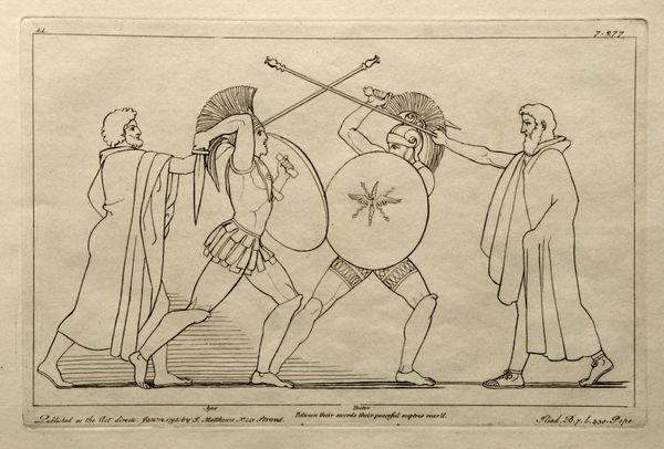 John Flaxman created this pen and ink drawing, "Illustration to the Iliad," during a time when Europe was captivated by classical antiquity. Flaxman, like many of his contemporaries, was deeply influenced by the art and literature of ancient Greece and Rome. In this illustration, we see a scene of violence and conflict taken straight from Homer's epic poem. Flaxman strips away the elaborate detail, focusing instead on the human form and the raw emotion of the moment. The figures, rendered in simple lines, embody classical ideals of heroism and strength. Yet, there's also a vulnerability in their poses, a reminder of the human cost of war. The fallen figure is a stark reminder of mortality, challenging any glorification of battle. Flaxman's neoclassical style emphasizes order and reason, but beneath the surface, the "Iliad" grapples with themes of fate, rage, and the complexities of human relationships, reflecting enduring aspects of our shared human experience.