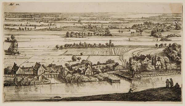 Curator: Jan Ruischer's "Village on a River," etched sometime between 1609 and 1690, gives us a sprawling view of a Dutch landscape. It's a seemingly simple scene rendered with such intricate detail. Editor: It’s funny, it feels a bit… distant, you know? Like peering through time itself. The lack of strong contrast makes the whole scene blend together into this muted, dreamlike recollection. Almost like looking through a very old memory. Curator: Indeed, there is a feeling of looking at the dawn of our industrial landscape. The piece really showcases how interconnected land, water, and settlements were in Dutch society, right? It is about infrastructure, water management, how people lived, worked, and even moved. See the figures on the banks and the fisherman pulling a pike from the water? This work presents a specific viewpoint. Editor: Exactly, it’s not just a pretty picture. It invites a conversation about labor, about resource extraction, even class! I see that and I also note who the images benefit, the rising merchant class, no? These tranquil scenes were, I think, tools for naturalizing exploitation as pretty, nostalgic. Curator: I think that you do make a strong argument, however, I feel transported into the artwork. It's not just about what's depicted, but about the very act of depiction. Ruischer wasn't simply recording a scene, he was curating a perspective. He was creating his own world with pen and ink. What I call romantic I see you feel is a loaded idea! Editor: True enough. Perhaps what I am feeling and trying to unpack *is* romanticization itself. Even if the scene feels ordinary at first glance, its very existence raises crucial questions. Questions about who benefits from idyllic narratives and who is made invisible within them. Curator: I find, overall, in this small drawing, there's a certain honesty about the mundane beauty around us, about seeing something familiar with new eyes, perhaps like these words that came from us here. Editor: Perhaps... to engage with that beauty means also engaging with its complexities, its contradictions, what hides and who profits, not romanticizing. It calls for vigilance, always.