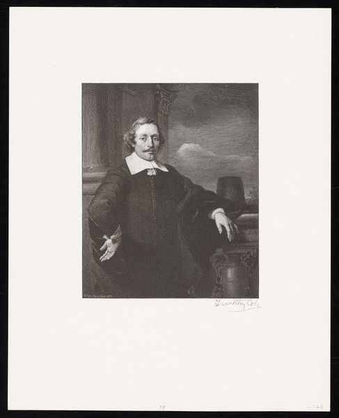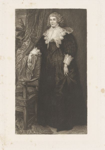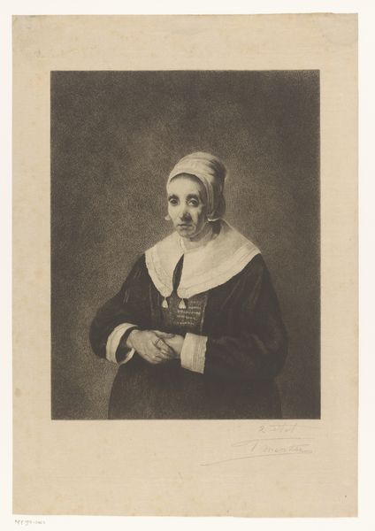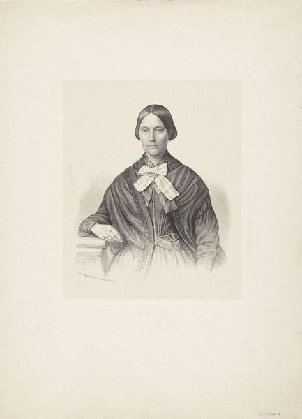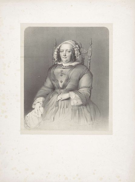 Curator: At first glance, this work has a somewhat somber air. It feels reserved, like a glimpse into a very private space. Editor: Indeed. Here we have "Portret van mevrouw Amersfoordt," or "Portrait of Mrs. Amersfoordt," rendered in the period between 1823 and 1900. The artist, Johann Wilhelm Kaiser, employed pencil and etching to create this striking image, now housed here at the Rijksmuseum. Curator: The gray scale creates a sense of seriousness, almost historical distance. The woman’s attire, particularly the shawl and the brooch, suggest a certain status, or at least an intention to convey one. But her direct gaze also suggests some level of vulnerability. Editor: Absolutely. Consider the artistic trends during this time, too. The early 19th century was marked by a burgeoning middle class, keen to solidify their place in society. Portraiture became a tool, almost a form of visual branding. Notice, however, the absence of overtly opulent symbols. It’s a reserved display of status, aligning perhaps with the values of a burgeoning Dutch middle class. Curator: That resonates. It also makes me wonder about her personal story, beyond her social positioning. The inclusion of flowers and what appears to be a book gives me pause. Those may act as placeholders of domesticity and intelligence, standard iconographic flourishes. Editor: Precisely, these are symbolic gestures deeply ingrained within portraiture conventions. The flowers could indicate virtues, while the book signals literacy and engagement with the world of ideas. However, these symbols gain their resonance through a complex socio-cultural understanding. The public display of art allows access for these discussions. Curator: Seeing how we've considered the elements – technique, era, symbolism - allows to a better reflection about how societal narratives weave their way through these portraits. Editor: Very well put. Indeed, the portrait can then provide both a window into history, and mirror for our present, reflecting the enduring human desire to be seen, understood, and remembered.