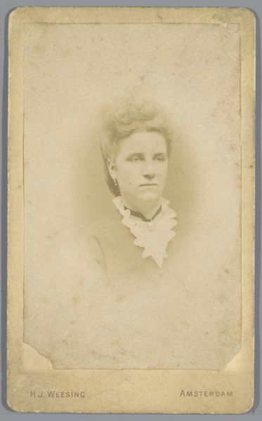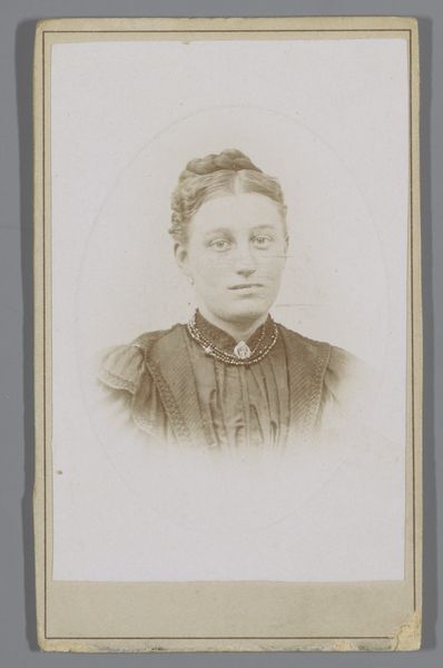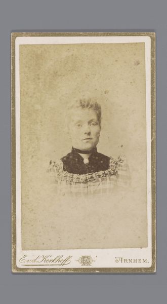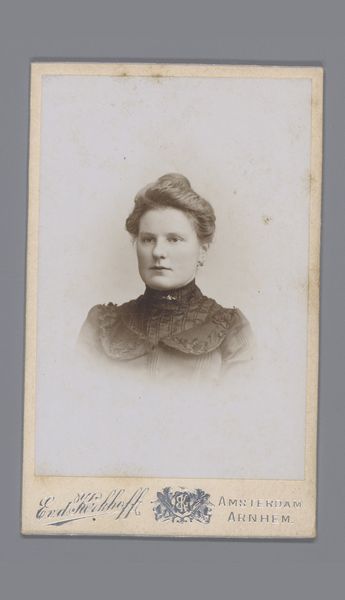 This is a portrait photograph, probably from the late 19th century, by Atelier de Jong. What strikes me immediately is how the sepia tones and soft focus give the image an ethereal, dreamlike quality. It’s as if the process of making the photo is right there on the surface, not trying to hide itself. The texture of the paper and the slight imperfections in the developing process feel very present, like ghosts of the past. Look closely at the way the light catches her face, particularly around her eyes. There's a gentle contrast that brings out a subtle expression. Photography, like painting, is a conversation with the past, always building on what came before, even if it's just to push against it. It's also an open-ended invitation for us to bring our own experiences to the table, to see what resonates and what doesn't.