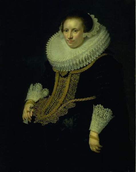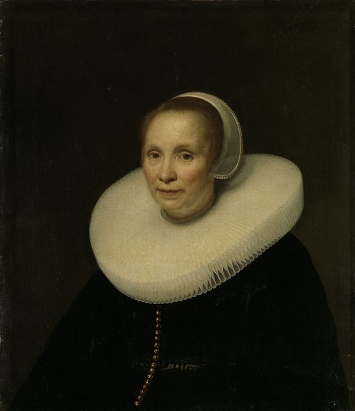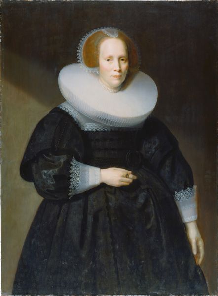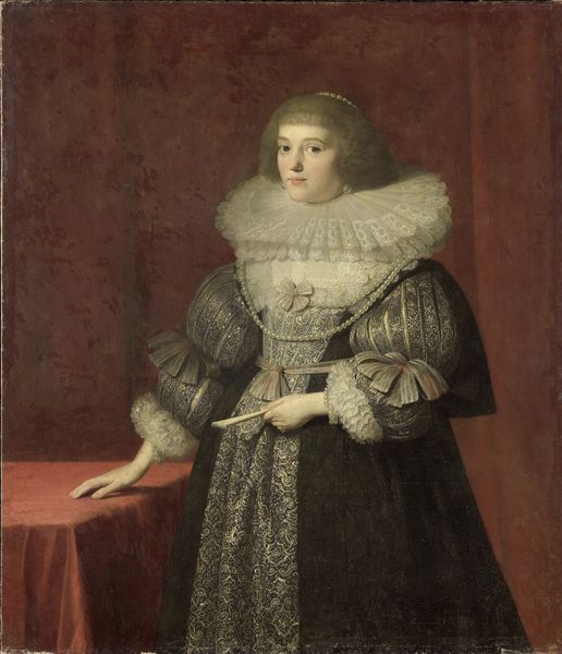Editor: This is Johann Friedrich Trescher's "Portrait of Maria Margareta von Holzhausen," currently residing in the Städel Museum. It's an oil painting, and its dark palette and composition lend it a rather solemn air. What immediately strikes me is the stark contrast between the woman's dark dress and the elaborate white lace of her collar and cuffs. What else do you see in this piece? Curator: The composition adheres to the Baroque aesthetic, yet the brushwork demonstrates restraint. Note how the light meticulously sculpts the subject’s face, yet diffuses subtly across the dress. Can you perceive how the limited color palette serves not to diminish, but rather to intensify the impact of textural contrasts – the smoothness of her skin against the crispness of the lace, the matte of the dress versus the glint of the jewelry? Editor: I do see that! The textures are very tactile despite the limited colors. The shadows cast by the pillar in the background add to the depth, but the details feel a bit uneven. Curator: Uneven, perhaps, yet deliberate. Notice how the architectonic pillar and draped curtain introduce linear structures. This contrasts to the rounded forms of her face, arms and the lemon she is holding. Do you agree? Editor: I think so! It almost seems the structural forms on the left side are meant to subtly counter her gentler features. It is almost as though the architecture enhances the roundness of her face. I also think that what looks like a lemon in her hand contrasts texturally to the jewels she wears. Curator: Precisely! One element echoes against the other, creating harmony while delineating status through signifiers of material and technique. These deliberate orchestrations underscore how the formal language shapes the image. Through formal analysis of brushstroke, compositional form and restricted tonality, the intrinsic elements converge on more than merely mimesis: but reveal the work's structure and meaning. Editor: That's fascinating. I hadn't considered how much the artist uses texture and structure to create a powerful visual narrative.
