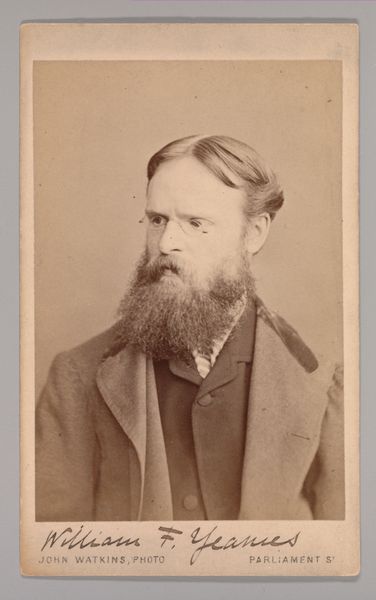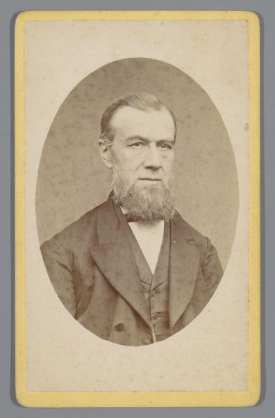 Curator: This is an untitled portrait by Mathew Brady, likely taken in his Washington, D.C. studio. It depicts a man in profile, captured in the distinctive sepia tones of early photography. Editor: There’s a real gravity to this image. His beard, so meticulously captured, seems to symbolize wisdom, doesn't it? A kind of silent authority. Curator: Brady certainly understood the power of imagery in shaping public perception. His studio became synonymous with portraits of political and cultural figures during a pivotal time in American history. This image speaks to how portraiture served to build and solidify reputations in the 19th century. Editor: The meticulous detail in his beard also speaks to a broader cultural trend. Beards, during this period, were markers of masculinity and intellectualism. The man's gaze is directed away, perhaps suggesting a forward-thinking attitude. Curator: Exactly. Brady capitalized on this trend, creating a visual archive of prominent men who embodied the ideals of the era. And by placing his name prominently on the card, he further cemented his own status as a recorder of history. Editor: It's a fascinating window into the past, and a testament to the enduring power of the photographic image. Curator: Indeed. It highlights the intricate relationship between visual representation and the construction of identity during the rise of photography.