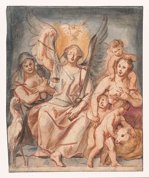 Charles Howard Hodges created this aquatint print titled "Kruisafneming", likely in the late 18th or early 19th century. Aquatint is a printmaking technique that simulates the effects of watercolor, using acid to etch a tonal pattern on a metal plate. Hodges, active in the Netherlands, was known for his portraits and reproductions of older paintings. Here, the aquatint medium lends a soft, atmospheric quality to the emotionally charged scene of Christ's removal from the cross. The textured surface of the print, achieved through the careful application of resin and acid, mimics the subtle gradations of light and shadow found in paintings. Consider the labor involved: the artist's hand in preparing the plate, the repetitive action of printing, and the distribution of the image to a wider audience. This reproductive method allowed for broader access to religious imagery, extending its reach beyond the realm of unique, hand-painted artworks. Hodges's choice of aquatint democratized art, making it available to a growing middle class, thereby blurring the lines between traditional fine art and commercial printmaking.