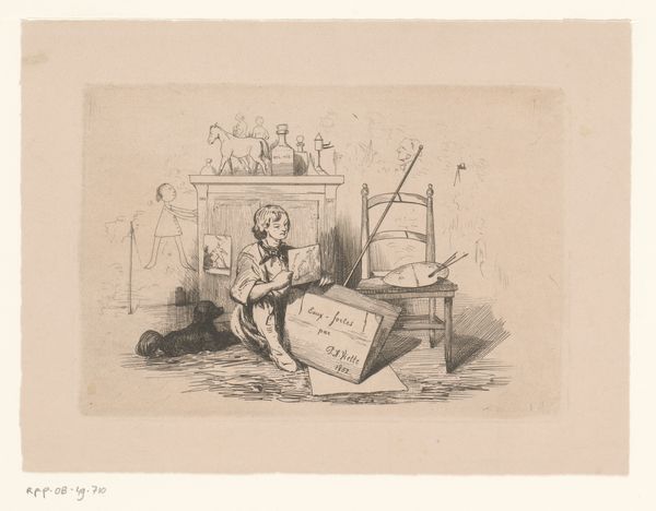 Johan Michaël Schmidt Crans created this print in 1874, a sardonic commentary on the glut of commemorative writings during a jubilee. At first glance, it's a simple scene: a boy struggles to pull a massive sack filled with 'festive gifts', 'occasional writings', 'jubilees', and 'speeches', while a shopkeeper looks on with a smirk. But it's layered with social critique. The image speaks to the commodification of sentiment and the sometimes absurd outpouring of obligatory praise during public celebrations. Who benefits from these 'festive gifts'? Are they genuine expressions or just commercial fodder? The artist certainly seems to suggest the latter, highlighting the tension between sincere emotion and performative expression. The sheer size of the sack and the boy's struggle poignantly reflects the burden of these manufactured sentiments. Through humor, the artwork invites us to reflect on the nature of public expression and the societal pressures that shape it.