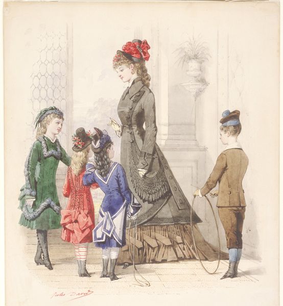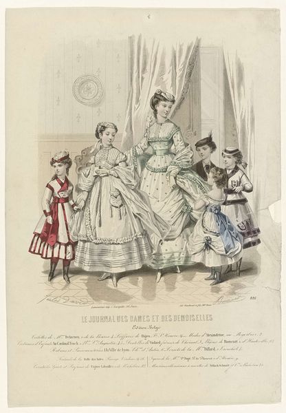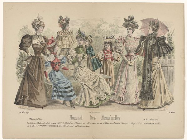 Curator: What a collection of fin-de-siècle fashion! This mixed-media print is titled "Journal des Demoiselles, 1 novembre 1892, No. 4910 : Toilettes et Modes (...)", and it’s attributed to A. Chaillot from 1892. Immediately striking, don’t you think? Editor: Definitely! It's like a tableau of late 19th-century ideals. The arrangement of figures—their verticality—creates this elegant, almost austere composition. The palette, muted yet vibrant, pulls you in. Curator: Right! It served as a fashion plate in the "Journal des Demoiselles", which offered monthly insights into couture trends aimed toward upper-class women. These weren't just whimsical sketches; they guided garment construction and fabric selection. Editor: Yes, look at the meticulous detailing of the textiles. It's not just representation; it's almost an instruction manual, really telegraphing texture and drape to the consumers of the day. How else would they instruct their seamstresses? Curator: Precisely. Also, observe the material circumstances underpinning their display. The cost of producing these fashion plates, distributing them, and the fabrics they advertised presupposes a globalized system of production with different social implications depending on where one stands in relation to it. Editor: That's fascinating. Looking more closely at each figure and their constructed reality through dress makes it hard to separate form and content. Those hourglass silhouettes are a real accomplishment, speaking to both luxury and the limiting gender constraints of the time. Curator: I agree. It is not simply art; it's a manufactured vision sold with significant cultural influence! It suggests how the aspirational lifestyle of wealthy Parisians, constructed via publications and clothes, was made appealing and spread globally. Editor: Considering its inherent visual balance and period charm makes me realize this "Journal" and these figures aren't frozen in history; there is constant visual renewal for the viewer, don't you think? Curator: I do. It reminds us of the labor and artistry involved in even seemingly superficial things like fashion. It invites consideration for both the creators and consumers operating within these economies of display. Editor: Indeed. It offers a complex and attractive statement to appreciate both visually and within its specific era.