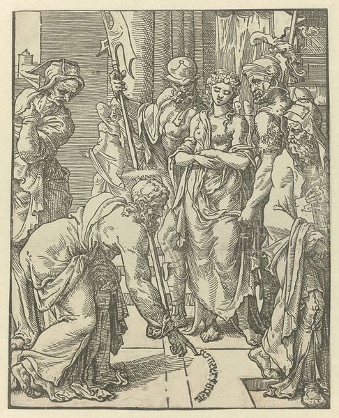 Curator: This engraving presents “Heilige Cecilia met muziekinstrumenten omringd door vier heiligen,” or "Saint Cecilia with Musical Instruments Surrounded by Four Saints", created sometime between 1515 and 1566. It is currently held in the Rijksmuseum's collection. Editor: Well, it's a bit busy for my taste. Kind of an overwhelming composition, what with the throng of saints down below and a cluster of cherubic types up top in the clouds. A lot going on. Curator: Indeed. Semiotically speaking, the organization functions as a hierarchical representation of the celestial versus the terrestrial. Consider the composition’s division; it neatly encapsulates sacred and temporal planes. Editor: Right, but even if I grant that…Cecilia herself, with that glum expression and her fistful of panpipes, doesn’t seem too thrilled about being the patron saint of music. Though I will say, the discarded instruments scattered around her feet create an intriguing tableau. Broken lutes and forgotten song. A bit morbid, really. Curator: Notice how her positioning at the composition's centre draws the viewer’s eye directly towards her figure. Note also the artist's command of line, particularly in rendering the folds of drapery, creating visual interest and lending a sense of gravity to the scene. Editor: Oh, absolutely. Technically impressive. You can see how much time the artist put in the engraving, especially given the size of the work itself. Though, looking closer at Cecilia’s halo, there's a somewhat carefree looseness, if not slap-dash, rendering when contrasted with other meticulous detailing throughout. I wonder what that signifies, intentionally, if at all? Perhaps nothing. Still, gives a raw edge to it. Curator: Such considerations illuminate a dichotomy, pitting calculated symbolic placement with more carefree execution in elements such as a loosely interpreted halo. Together they present a cohesive visual construction. Editor: I love your perspective. Makes me want to compose something – maybe not an overly busy musical number, or an artwork for that matter – and explore some dichotomies of my own! I definitely have a different feel for it now, though I don’t think I could warm up to all those stony saints!
