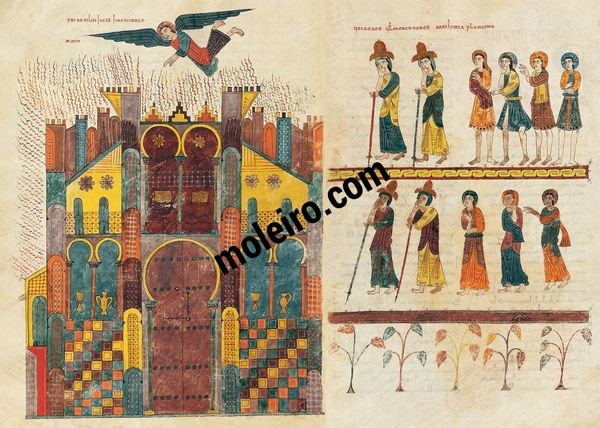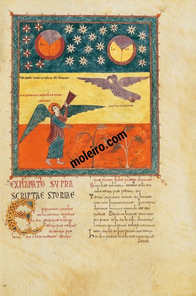 Ende, a female artist, created this vibrant illustration about St. John, likely around the year 1000, using vivid colors and stylized forms. Note the angel handing a rod to St. John, a clear directive to measure the temple. This act echoes ancient Egyptian surveying rituals, where measuring was not merely practical but also a sacred act of defining space and order. The rod, a symbol of authority and divine mandate, has roots stretching back to the scepters of pharaohs, reflecting power structures. Consider the gesture of measuring itself. The act carries a profound psychological weight, suggesting control, understanding, and an attempt to impose order on the unknown. The depiction resonates with our innate human desire to quantify and comprehend the world around us. The motif of measurement evolves through art history, from the scales of justice in classical art to the scientific instruments in Renaissance paintings. This image invites us to contemplate how symbols resurface and adapt, speaking to enduring human concerns across centuries.