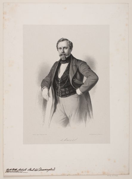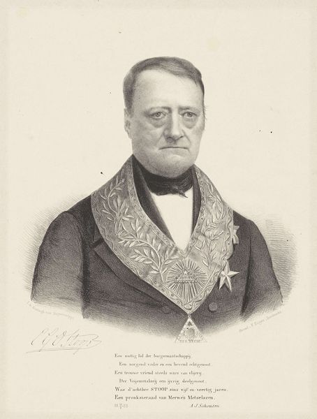 Curator: This is a lithograph from 1862, titled "F. H. Grüner," now housed in the collection of the Statens Museum for Kunst. Editor: There's a rather imposing figure, isn't there? Stern, but with an air of… well, satisfaction, perhaps. The artist uses strong chiaroscuro. It accentuates a palpable presence. Curator: It’s a striking depiction, no doubt. Lithography during this period offered artists a cost-effective way to disseminate imagery, particularly portraits of notable figures to wider audiences. Grüner, I believe, was a figure of some local prominence. Editor: The texture is remarkable, isn’t it? Notice how the hatching creates depth, particularly in the coat, yet it also manages a certain lightness around the face. The gaze is quite compelling; though fixed to the side, there is a commanding self-assuredness. Curator: Indeed. In terms of visual politics, the portrait style aligns with the emergent national identities forming at that time, presenting the subject as a pillar of society. The lack of ornate background also emphasizes this and focuses on the subject's importance. Editor: Yet that bare background provides an intriguing minimalist quality, almost isolating him. There's something quite potent in that very lack. Also note how the button placement draws attention down to the corner where the subject fades off the page, a subtle form of depth I appreciate. Curator: An interesting point. The choice of rendering him in lithograph would, of course, have political implications. Was the goal of the work for broad dissemination? How might that intention impact our understanding of Grüner and the role he played? Editor: Perhaps, or maybe the artist admired the texture achievable through lithography, which creates that illusion of weight. We should consider how lithography lends itself to portraying character, shaping our perceptions and ideas around this character. Curator: It's a nuanced interaction between those aesthetic capabilities of the media and their reception in the time of great political changes. This tension encapsulates why Grüner is more than just a historical record, but also an enduring social artifact. Editor: Well put. The image certainly captures the spirit of an era and a specific sense of personal conviction.