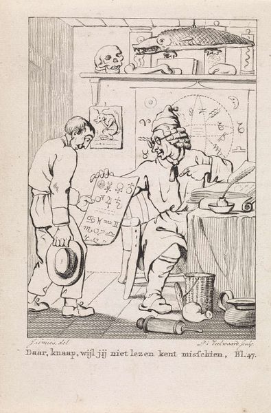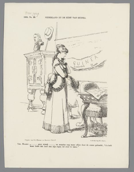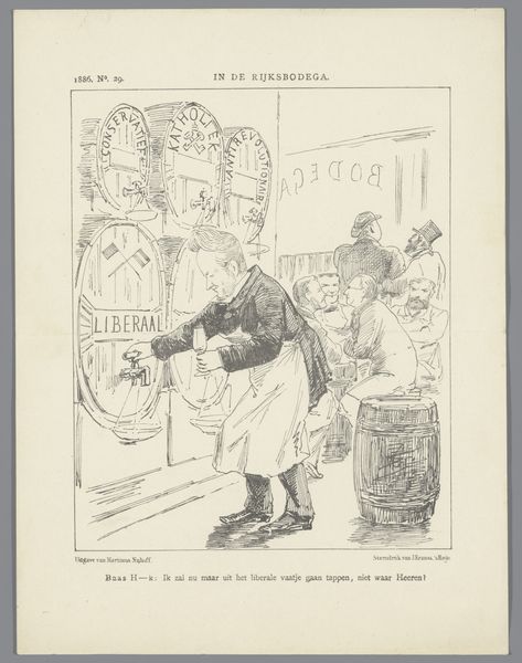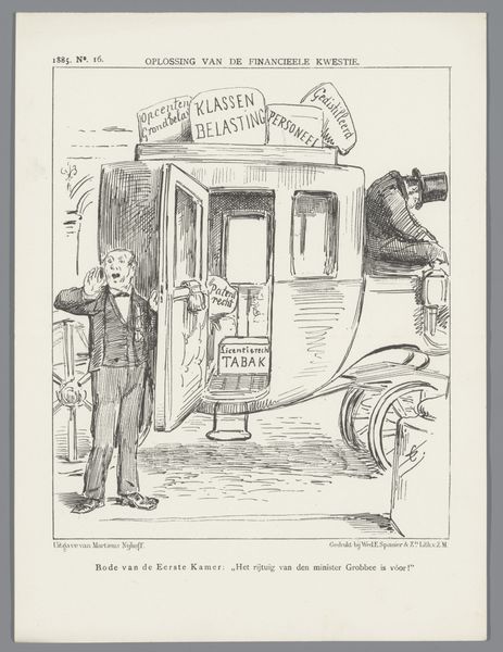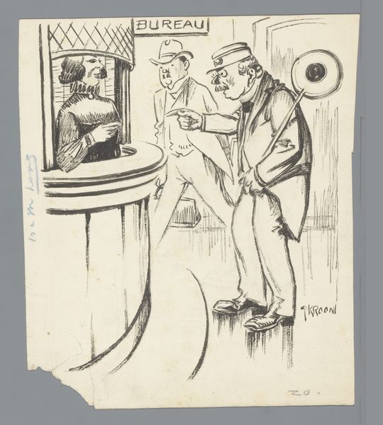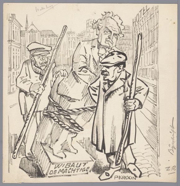 Curator: Patricq Kroon, a Dutch artist, created this ink and pen drawing, titled "Colijn in slecht weer," around 1923. The scene captures a man seemingly caught in the rain. What strikes you about it at first glance? Editor: It has a rather stark and humorous quality, wouldn't you agree? The lines are jagged and forceful, really capturing a sense of chaos and discomfort with that bad weather of the title. The monochrome also heightens this stark, almost theatrical effect, highlighting the almost crude geometry of his figure. Curator: Absolutely, the rawness of the style lends itself to some pointed satire, if we examine some of the broader social and political circumstances in the Netherlands at the time. We see that the man, supposedly Colijn, is passing by two signs mentioning, on the one hand, political discourse (“Nolens Westerveld”), and, on the other hand, what looks to me as a call for national unity ("In Eenheid"). Colijn might not literally be experiencing "bad weather", but a complicated political moment, or possibly being presented as an enthusiast "vaderlander". Editor: That's insightful. Considering the forms, the repetition of angled lines suggests the pouring rain, but there’s a disjointedness about them, as though the composition itself reflects this state of disarray or unease you mention. Even the figure, in contrast with what he is doing, with those exaggerated features, seems not merely weather-beaten but purposefully caricatured, as he gestures as though nothing were the matter with the state of his clothes. Curator: The caricature really enhances that layer of social critique, pointing to debates over Dutch identity and political solidarity in a period of rapid change, wouldn't you agree? Is the figure simply ignoring political unrest or, actively seeking refuge in the nearest refuge he might find? Editor: Interesting that his umbrella lies discarded—abandoned in the entrance as a form or revolt—perhaps reinforcing an overall visual language about failure, chaos, or some sort of collapse of that nationalist pretense? Curator: Yes, a visual manifestation of societal tensions made evermore visible when he cannot keep a stance from "bad weather". Looking at it this way also tells us a lot about that transitional time in the history of Netherlands as he makes it visible through these stark forms. Editor: A great reminder of how careful formal analysis can reveal deeper thematic complexity and artistic intents!