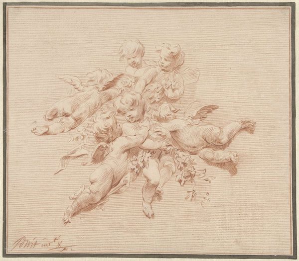 Editor: So, here we have Jacob de Wit’s "Ontwerp voor plafondschildering met Aurora," dating from sometime between 1705 and 1754. It’s an ink drawing on paper. It feels light and airy, almost like a dream. I’m curious, what’s your interpretation of a work like this? Curator: This piece provides a fascinating insight into the function of art within Baroque society. These ceiling paintings weren't simply decorative; they were often allegorical pronouncements of power, status, and perhaps even idealized narratives that the patrons wished to project. Editor: Interesting, so you are saying it is more than decoration. Curator: Exactly. Think about where this would be seen—likely in a grand home. What message does depicting Aurora, goddess of dawn, surrounded by putti, send to visitors? It's about ushering in enlightenment, a new era under the patronage of the family. Also the Baroque style with its flourishes serves that role to present power and authority. Editor: So it's like visual propaganda? A constructed narrative. Curator: You've hit upon a key aspect. Baroque art, particularly in the homes of the wealthy, acted as a visual manifestation of their self-image and aspirations, impacting the experience of everyone encountering it. Even the use of ink and paper, materials connected with documentation, suggests that this Baroque show of wealth sought validation, perhaps needing its record kept through this drawing. Editor: That gives me a lot to think about, viewing what I thought was “beautiful” in this period as serving the status quo. Thanks! Curator: Precisely! It reveals how deeply art is intertwined with the societal forces shaping its creation and reception. It’s not just about beauty, it’s about power, narrative, and who controls those narratives.