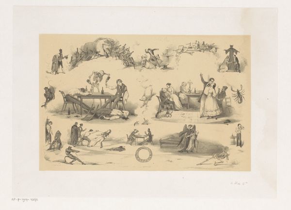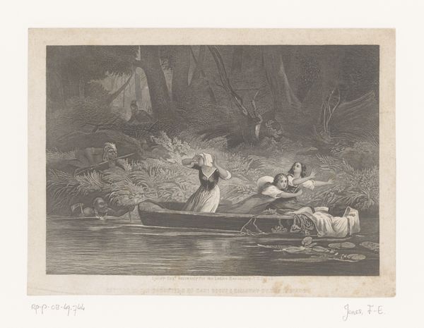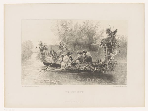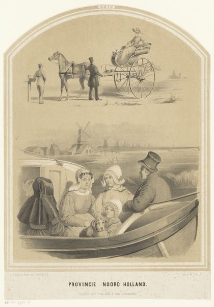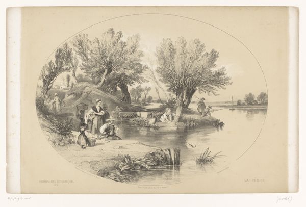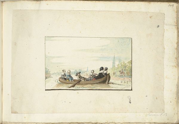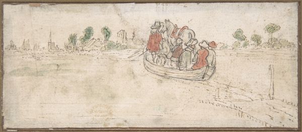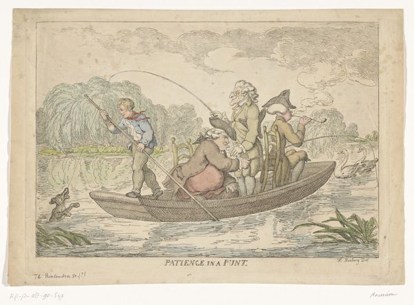 This print, "Landscape with Passengers in a Rowboat," is an anonymous work that captures a vibrant, idealized scene of leisure. The composition is divided horizontally: the lower part is dominated by the boat on the river, and the upper by figures on the shore. The river acts almost as a mirror, reflecting the lively interactions between the boat's occupants and those on land. The artist uses line and color to create a dynamic interplay between these two groups. Note the careful placement of figures and foliage to direct the viewer's eye across the scene, drawing attention to the emotional connections and social dynamics at play. Through its design elements, this print goes beyond mere representation. It invites us to consider the ways in which representations of leisure and landscape can shape our understanding of social harmony and collective identity. The symmetrical structure of the artwork highlights a desire for order and balance. The print offers a glimpse into cultural ideals of its time, but also prompts questions about how we continue to construct and consume images of collective identity and social interactions.