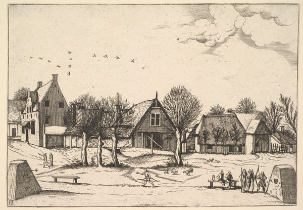 Editor: This drawing, titled "Gezicht op een dorp met een kerktoren," or "View of a Village with a Church Tower," created between 1559 and 1561 by Johannes or Lucas van Doetechum, captures a seemingly simple scene in ink. What I find fascinating is the way this humble, rural setting gains significance through the social implications of its architectural focal point—the church. What's your take? Curator: Well, looking at this engraving, it's important to understand the role of landscape imagery during the Northern Renaissance. These weren't just picturesque scenes; they were often tied to burgeoning national identities and burgeoning religious ideologies. Editor: That makes sense. How so? Curator: Think about it: the church tower isn’t just a landmark. It visually anchors the community, suggesting a shared belief system and, potentially, the controlling influence of religious institutions on daily life. Do you notice anything about how the houses compare to the church? Editor: Yes, the church is noticeably taller and seems more fortified. So, this piece isn’t just about showing a village, but possibly about suggesting a particular power dynamic within that community. Curator: Precisely! And these prints were widely distributed, making them important tools in shaping perceptions of the social landscape. This image, while seemingly serene, invites questions about power, faith, and communal life during a period of great religious and social change. Editor: I never thought of landscapes holding such significance. Now I see it's about more than just pretty scenery. Curator: Exactly. And that realization is key to appreciating its enduring impact on artistic expression and cultural memory.