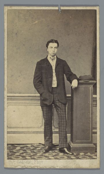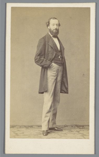 Curator: Let’s turn our attention now to this small yet compelling portrait. We know it as "Portret van een onbekende jongeman," dating from around 1855 to 1885. It is, of course, a photograph. Editor: It's remarkably faded, giving it this spectral quality. And there's some damage at the top...almost as if time itself is eating away at his image. I immediately want to know, what sort of chemistry and printing processes would have yielded this sepia tone and texture? Curator: Indeed. The fading speaks volumes about photographic processes in their relative infancy, and how institutions have come to collect and care for fragile works like these. Note the composition as well. This genre painting aesthetic, so to speak, mimicking painting through pose, props like his cane, and the backdrop. It elevates photography. Editor: Exactly. And this is no studio "snap"; it's constructed. I imagine the photographer directing him carefully: The tilt of his head, the placement of his hand…It's performative. The middle classes, mimicking aristocratic portraiture, claiming status. It is not "natural." It hides the labour. How were those clothes made? Where did he get the funds for a formal portrait? What choices did he have, photographically? Curator: And perhaps it served a societal function beyond pure status. Images like this, mass produced, facilitated burgeoning social networks, expanding notions of citizenship in the late 19th century, creating new ideas for gendered dress, ideas about what we see as respectability... Editor: Also the paper quality…was this carte de visite album or a mounted display print? What kind of coatings were involved and from what sources? These chemical layers matter; they change and degrade; that instability gives meaning to what we are seeing, this decay shows consumption. Curator: A fitting point to ponder as we reflect on a photographic legacy, its public presence, and this intimate view of a young man—unknown but suggestive—staring back at us. Editor: Indeed. Consider all the labor and chemistry gone into it to achieve this captured moment from another century.