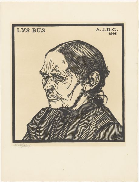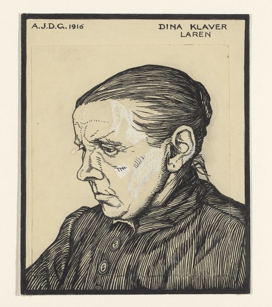 Editor: This is Julie de Graag’s “Portret van Hendricus Petrus Bremmer,” created in 1916 using ink. It's currently at the Rijksmuseum. The geometric patterns create a striking visual effect, almost like a woodcut, but it's ink. It feels very stylized. What do you see in this portrait? Curator: Note how the artist uses dense, parallel lines to build form and create a sense of volume. Consider the varying thicknesses and the stark contrast between light and shadow. These formal elements contribute to a dynamic visual texture, no? Editor: Yes, definitely. The lines really emphasize the contours of his face and give it a certain sharpness. Almost caricature-like? Curator: Precisely. Although described as a portrait, observe the almost geometric abstraction of Bremmer's features. The planes of the face, the stark angles – they are rendered not realistically, but rather as simplified, structured forms. The emphasis isn't on verisimilitude, but on the essence of form. Semiotically, the sharp lines communicate decisiveness, a certain sternness of character perhaps. Do you agree? Editor: I do. The almost exaggerated lines around the jaw and the focused gaze do suggest a determined personality. So the form here dictates our understanding. Curator: Absolutely. This goes beyond mere representation; it's about how De Graag interprets and reconstructs her subject through purely formal means, focusing our attention on structure. Editor: This was insightful. I learned a lot about how to analyze an artwork’s character solely based on lines and structure! Curator: Indeed, by studying its formal components we unveil artistic intention.