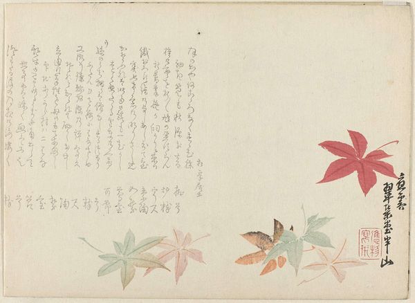 Sakai Hōitsu created this woodblock printed album in the 19th century. Hōitsu was a Japanese painter of the Rinpa school, which often drew inspiration from nature. This image of a deer evokes a sense of longing. The animal looks up toward the sky, as if listening to something we cannot hear. The deer, often considered a sacred animal, is depicted in a simplified and stylized way, capturing its essence with minimal lines and colors. The scattering of maple leaves reminds us of the fleeting nature of time. The deer and foliage might speak to the artist's own sense of identity within the natural world. This image encapsulates the Rinpa school’s ability to create a moment of quiet contemplation. It invites us to reflect on our own connection to nature and the emotions it stirs within us.