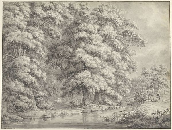 Editor: Here we have Hendrik Schwegman’s ink drawing from 1796, "Fishermen Casting a Net in the Pond of Elswout Estate." It's a lovely landscape, almost dreamlike, with these tiny figures enacting this scene, surrounded by dense trees reflected in the still water. The whole thing feels incredibly peaceful. What catches your eye, or perhaps stirs your imagination, when you look at this work? Curator: Oh, that's a wonderful starting point. I find myself drawn to the contrast between the meticulously rendered details of the trees and the almost ethereal quality of the light. It's as if Schwegman is trying to capture a fleeting moment, not just a place. It whispers of romanticism, this idealized view of nature and labor. What do you make of the scale, and the way figures blend with nature? Editor: I hadn't really thought about that. It’s a scene of work, sure, but the estate behind it, so distant. It makes me think about the relationship between humanity and nature during that period... Curator: Precisely! It is there as a reminder, though very faint. Maybe Schwegman aimed to depict a balanced view between our influence and the natural order. Consider how this scene differs from typical landscape paintings showing grand vistas or dramatic storms. This one's more subtle. What would you say? Is there something about its stillness that invites a slower, deeper observation? Editor: It is so calm, I guess. It gives one a sense of the everyday. What I find very interesting are those reflections in the pond. Like they're portals into another dimension. Curator: Wonderful observation! Perhaps those watery portals are hinting at the unseen. Think how fascinating it would be to stand in that time, see the landscape unfold with people in a harmony of space. It invites pondering on the ephemerality of life! Editor: Yeah. Seeing all this in the context of this piece is... unexpectedly beautiful. Curator: Absolutely, beauty that creeps up from its fine details! I must say, your observation, about the water being portals made me think about that too. Now I won't be able to see it another way.