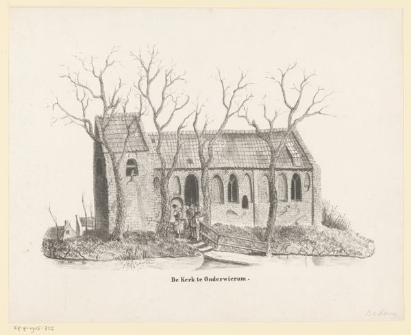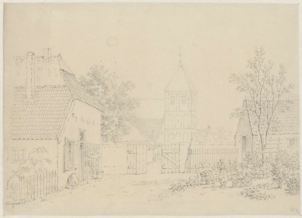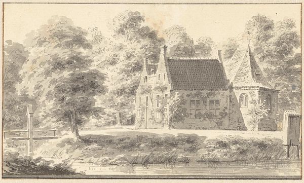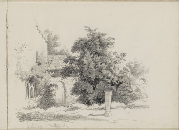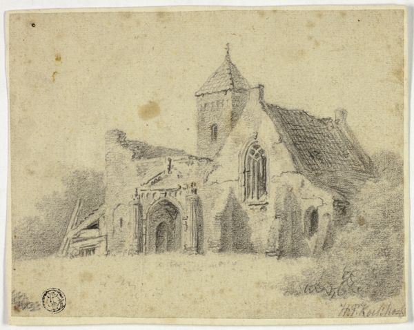 Gerrit Postma created "Kapel van Malling Abbey" using pencil. The image is dominated by architectural forms rendered with precise linework and tonal variation. The composition uses an eye-level perspective with the chapel buildings placed slightly off-center. This lends a dynamic balance to the piece. The contrast between light and shadow models the three-dimensional forms and textures, from the rough stone to foliage. Postma invites a deeper reading by destabilizing clear boundaries between categories; structure and nature merge. The arched gateway creates a frame, emphasizing the depth of the image. The formal properties of line and shading construct a play between the solid permanence of architecture and the ephemeral qualities of light and shadow. The drawing reflects an interplay between observation and the artist's interpretive intervention, blurring the distinction between reality and representation. It is within this tension that the work generates meaning, inviting viewers to engage in an ongoing process of interpretation and reflection.
