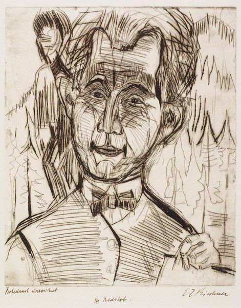 Ernst Ludwig Kirchner made this etching, called The Painter, with ink and a printing press. Notice how the lines are hatched and scratchy? It’s like he's thinking aloud with the marks, not trying to hide the process. Look at the way he defines the planes of the face with these nervous, vibrating lines. It’s not about capturing a likeness, it’s about feeling the energy of the person. The ink isn’t precious, it's almost dirty, clinging to the paper. Then there's this sort of strange sculpture, maybe a figure of a cat or a snake, perched on the table. It feels totemic, primal. Kirchner reminds me of someone like Munch, in the way he uses line to express raw emotion, even if that emotion is sort of fraught. Ultimately, this piece reminds us that art isn't just about what we see, but how we feel.