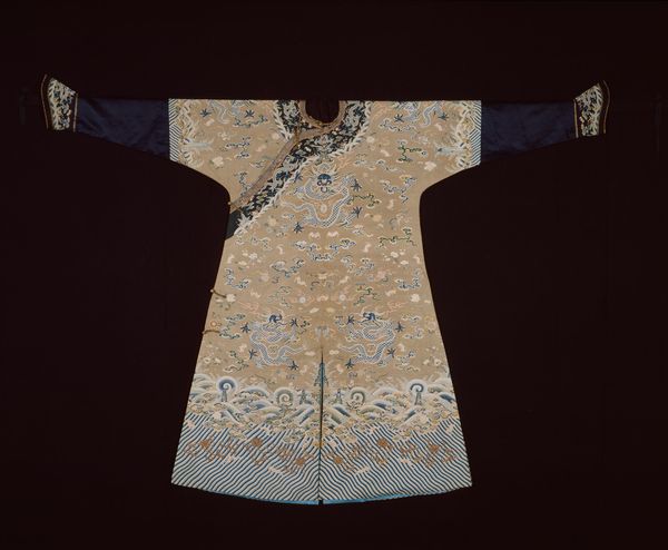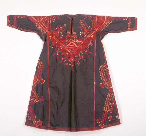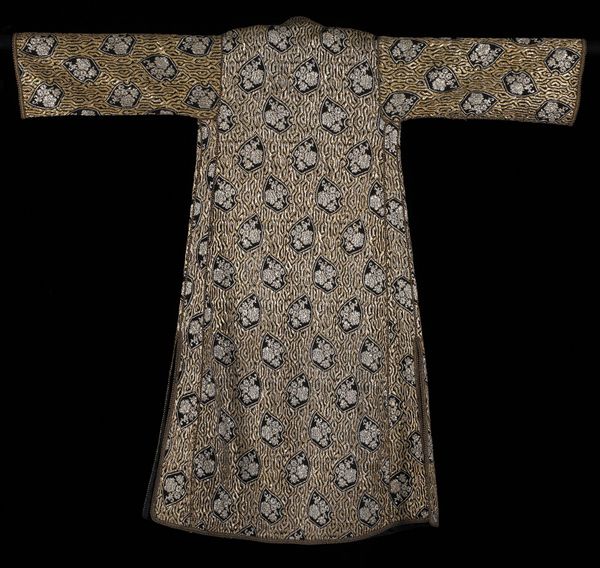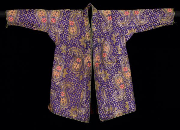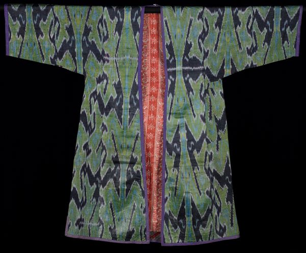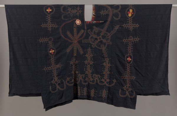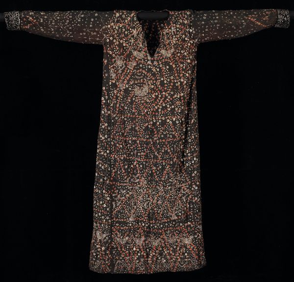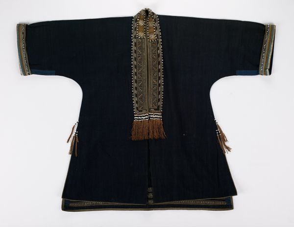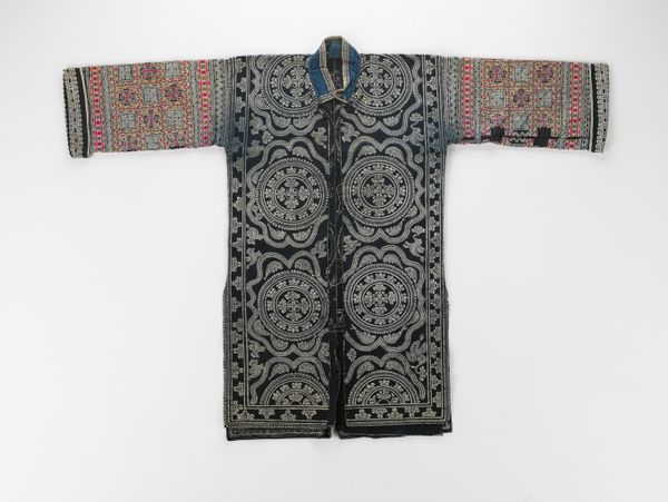 This coat, made by an anonymous artist, welcomes us with open arms, or rather, sleeves. The deep indigo, shot through with electric blues and punctuated by small white ovals, offers a striking visual rhythm. Consider the composition: the symmetrical cut, combined with the dynamic, almost chaotic, ikat pattern. It’s a play between order and disorder, reflecting perhaps the tension between individual expression and the constraints of cultural norms. The ikat technique itself, where threads are dyed before weaving, embodies a negotiation between intention and chance. Now, look at the coat’s materiality – the way the fabric drapes and folds. These soft curves contrast with the sharp angles of the geometric design. The interplay softens what could be a severe visual experience. This garment operates on multiple levels: as a functional object, a canvas for artistic expression, and a symbol of cultural identity. The beauty of this piece lies not just in its aesthetic appeal but in its ability to prompt questions about the nature of identity, tradition, and the complex relationship between art and life.