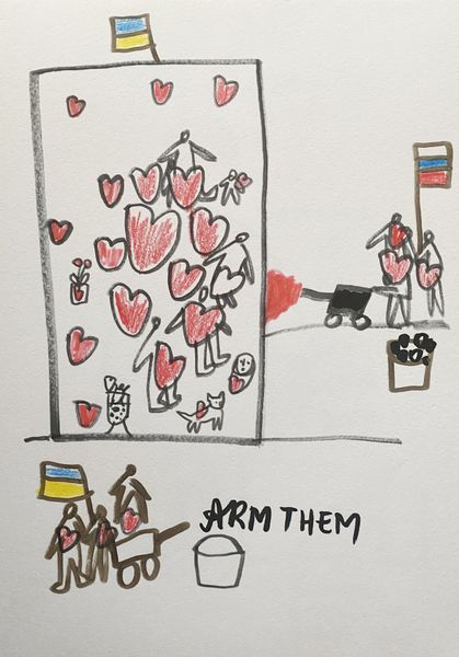 This drawing, made with what appears to be felt-tip pen by Alevtyna Kakhidze, captures a powerful moment of defiance in Henichesk, Ukraine, on February 26, 2022. The most striking symbol is the sunflower, laden with meaning. The sunflower has long been associated with Ukraine, and with the sun—of vitality and resistance. Here, the sunflower shifts from mere national symbol to a powerful statement against occupation. It's a motif reminiscent of ancient agrarian beliefs—the idea that life springs from death. The peasant's offering of seeds to the invaders echoes the cyclical nature of existence. The sunflower embodies hope and renewal amidst destruction. This simple, yet potent image, deeply ingrained in our collective consciousness, evokes profound emotional responses. It speaks to the resilience of the human spirit and the enduring power of symbolic gestures.