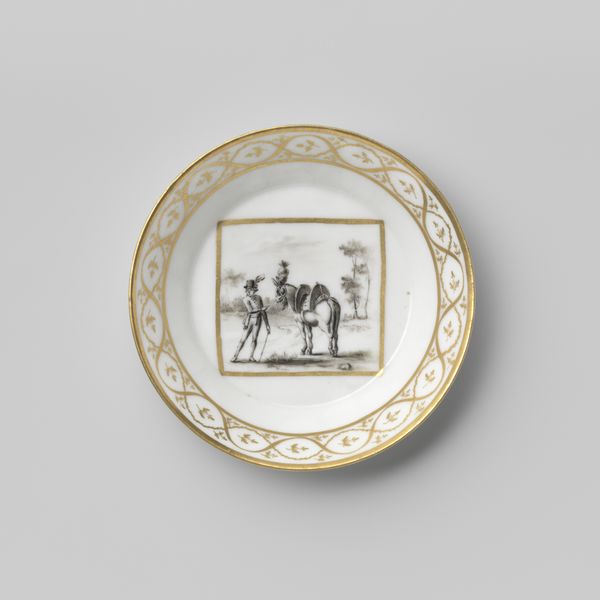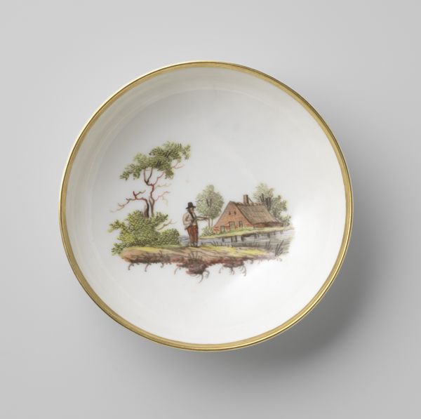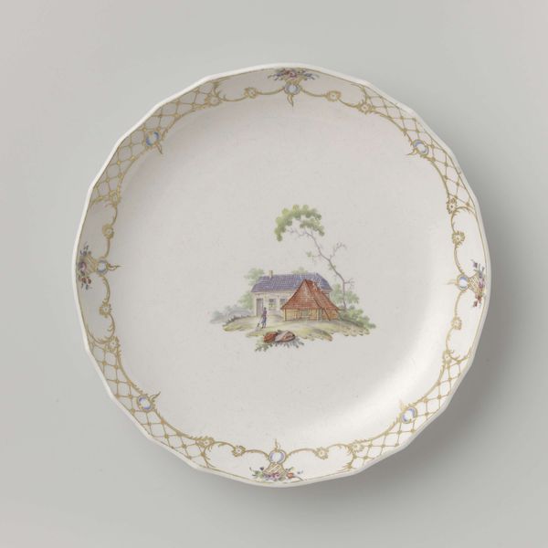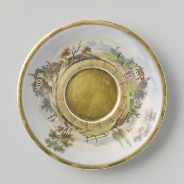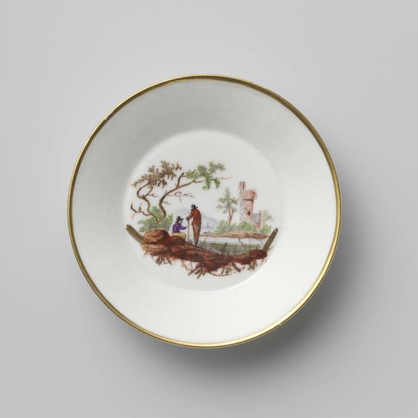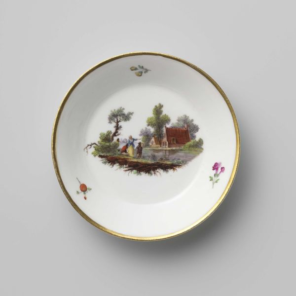 Curator: Looking at this delicate piece, we have a porcelain saucer produced by Wallendorf around 1780 to 1800. The decoration features a watercolor illustration of a water landscape with architectural elements, framed by elegant garlands. Editor: It's quite charming. The central landscape reminds me of a miniature painting. The whole thing exudes a refined, almost aristocratic sensibility. What strikes me is how deliberately it merges the decorative function with high art. Curator: Indeed. During the late 18th century, porcelain manufactories were deeply integrated into the fabric of European court life. Objects like these acted as diplomatic gifts, status symbols, and tools for projecting power through refined taste. The Rococo style adds a touch of elegance that was highly valued. Editor: Absolutely, but I am curious about the artisanal process here. The delicate nature of the watercolor on porcelain. It challenges the rigid hierarchy between art and craft. Someone dedicated skilled labor to each brushstroke. It makes me wonder, what were their working conditions and social status in Wallendorf? Curator: It's a crucial point to consider the hands behind such luxurious items. These manufactories operated with very strict divisions of labor. Highly specialized painters might work only on landscapes, and others exclusively on ornamental details. The system produced quality but it certainly also entailed specific working dynamics. Editor: And the landscape itself--how does that reflect social realities? Is it an idealized vision for the privileged, carefully separating itself from the material and social basis of the era? Curator: Very astute observations. Landscape paintings and depictions such as these were almost invariably idealized. They offer a kind of nostalgic retreat, aesthetically distancing themselves from burgeoning industrial development and related social disruption of the time. The presence of architectural elements indicates human control and cultivation of the land, thus symbolizing the patron's own world order. Editor: The material history offers another lens to consider what at first may seem simply picturesque, hinting towards a broader, fascinating perspective about art production in the eighteenth century. Curator: Precisely, reminding us of how this refined artistry always occurred within a social and historical context, often obscuring complex realities that it simultaneously represents.